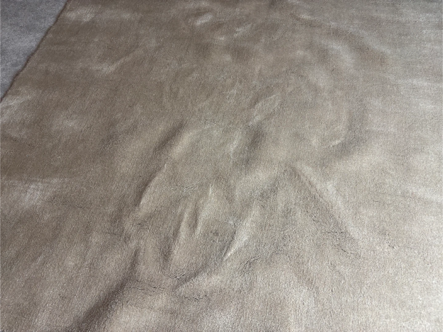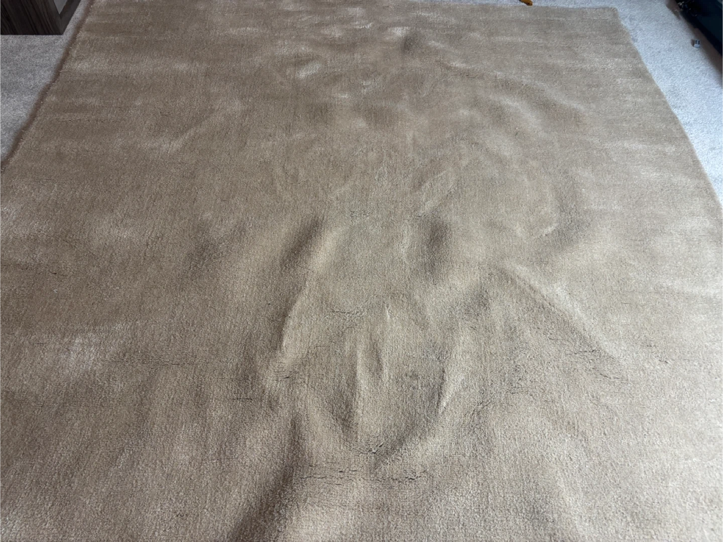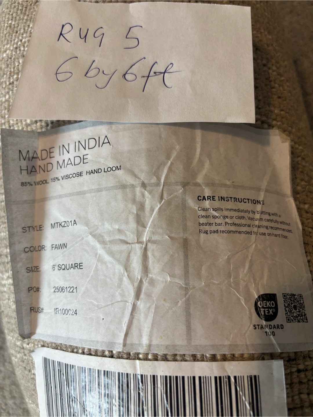 This is a 6' square rug, hand made in India. It's made of 85% wool and 15% viscose, and it's a fawn colour. This rug is suitable for a hand loom style! It's perfect for adding warmth to any room.