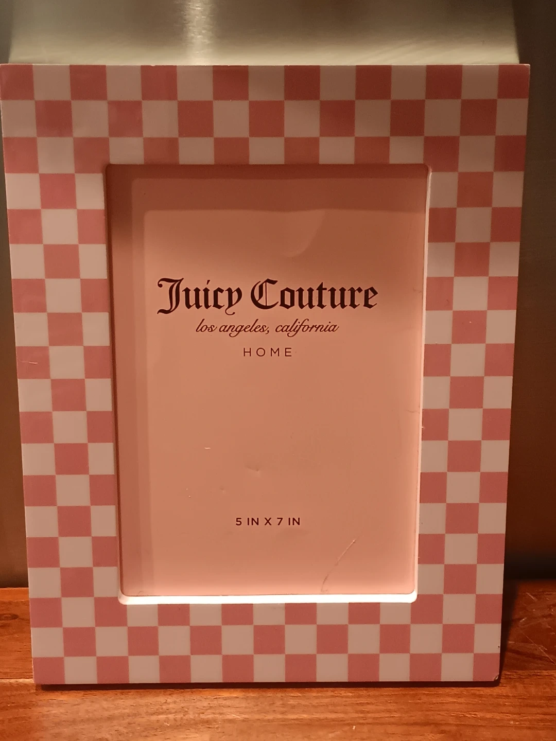 Juicy Couture photo frame in a pink gingham design. It's for a 5x7 inch photo. This frame would look cute on a dresser or shelf!
