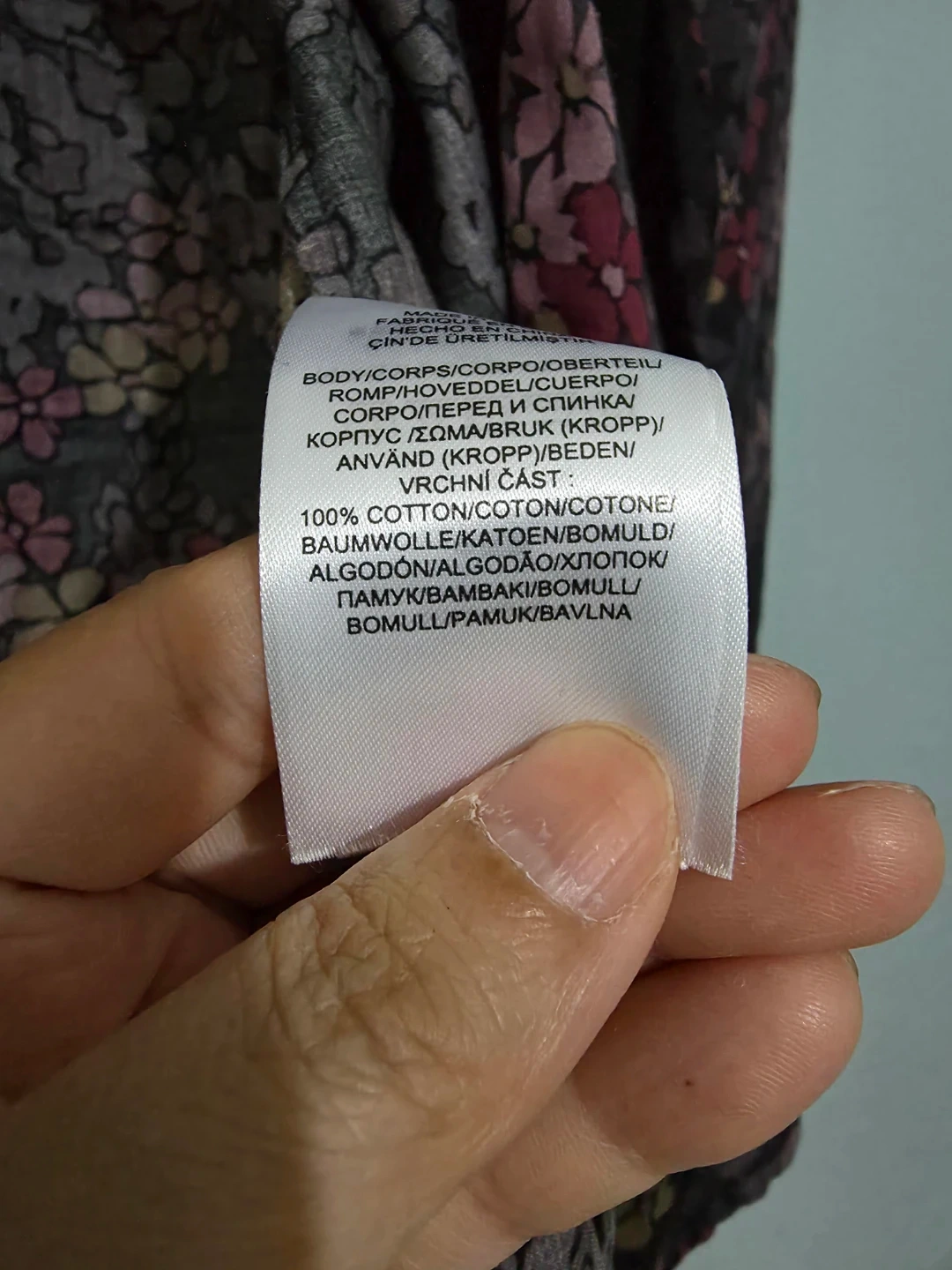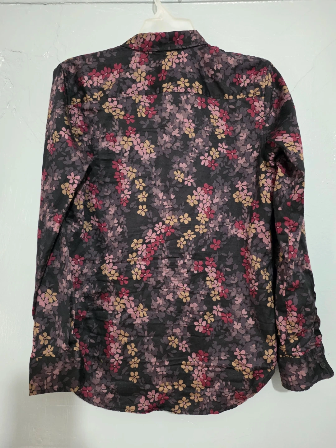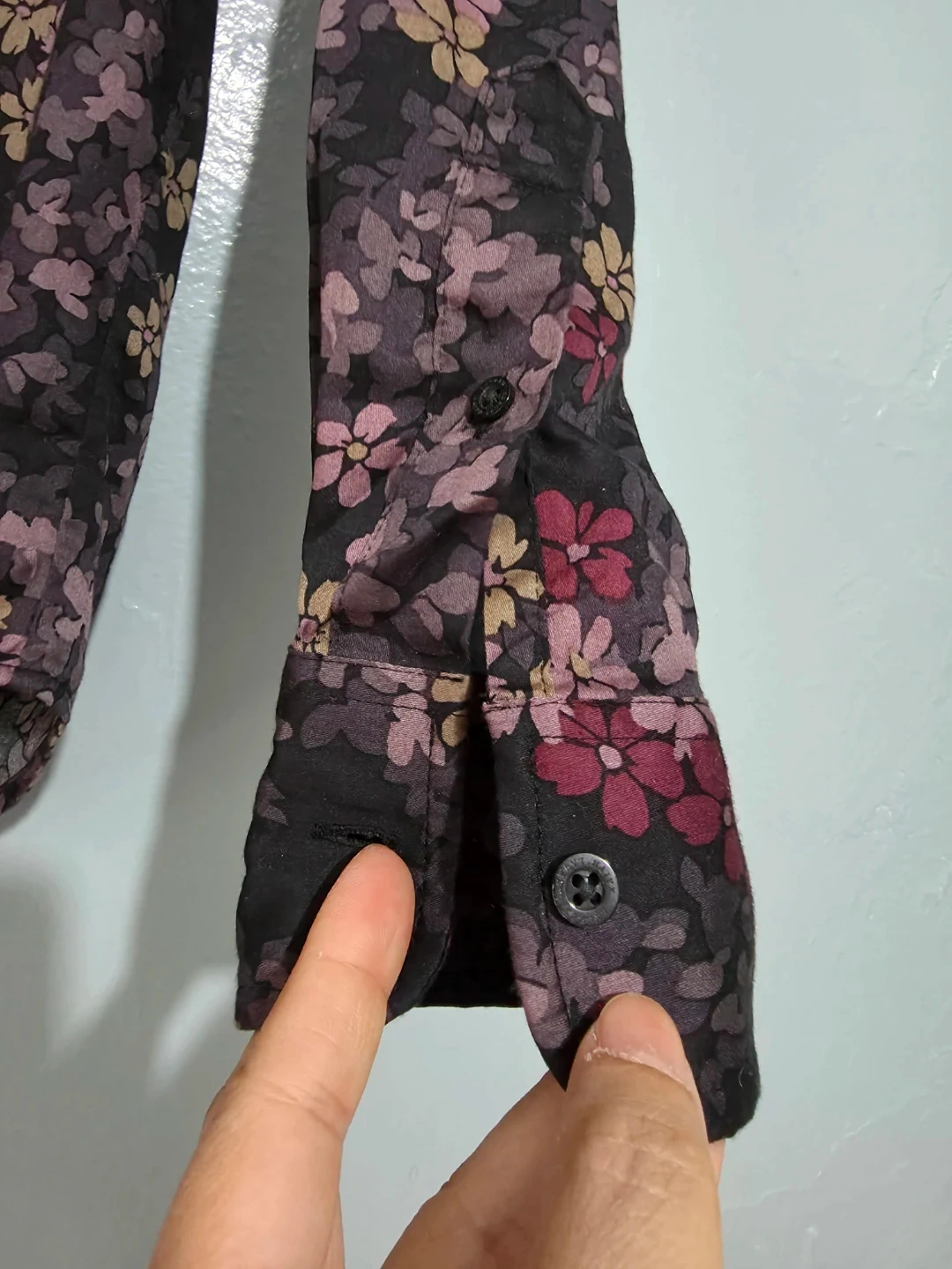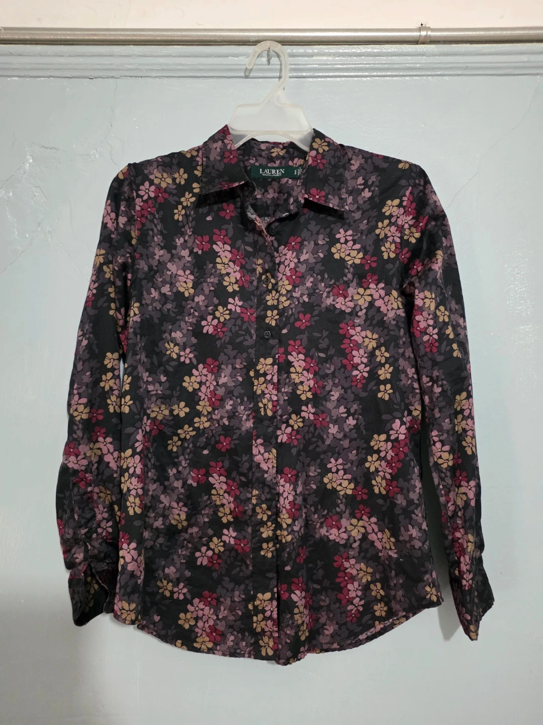 This Lauren Ralph Lauren button-down shirt features a dark floral print. There are 2 buttons at the wrist. It's made of 100% cotton. Slightly fitted. Size S.