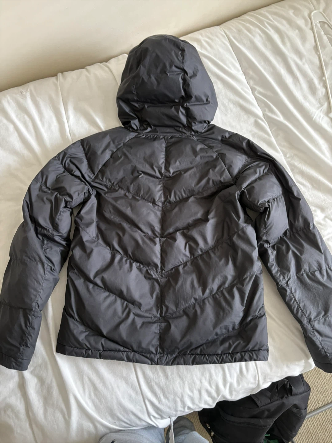 This Nike puffer jacket is black with a gold embroidered logo. It features a full zip closure and a hood for extra warmth. It's perfect for colder weather! Fits a size small men’s. Able to deliver.