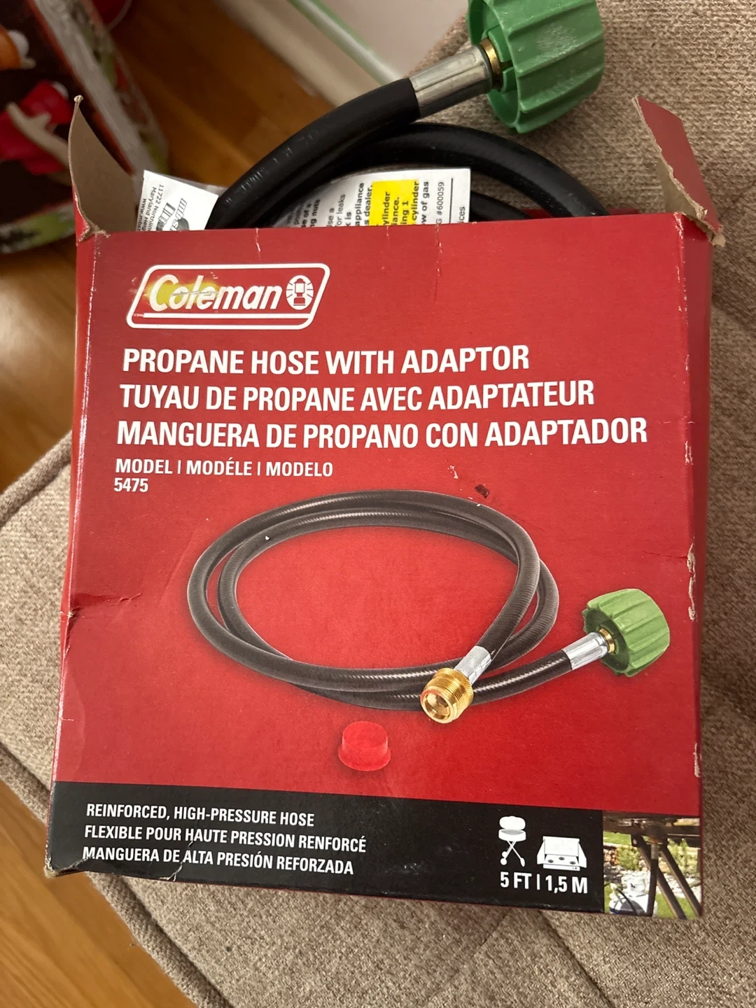 This is a Coleman propane hose with an adapter. It's a reinforced, high-pressure hose that's 5 feet long. It's suitable for connecting propane tanks to appliances.