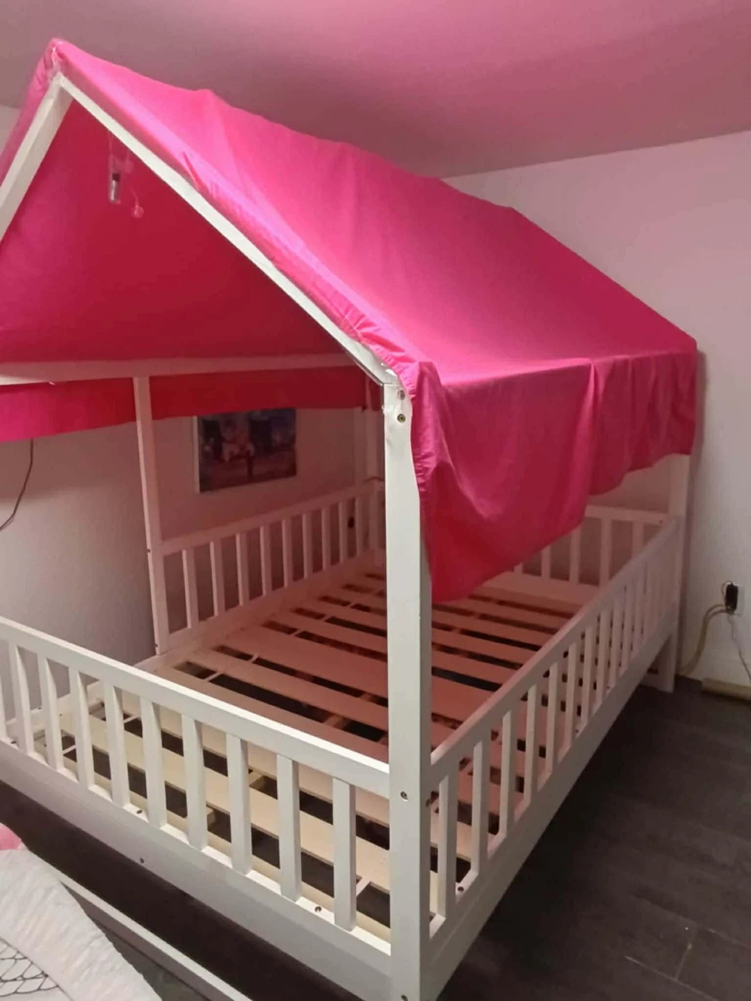 White wooden bed frame designed like a house with a vibrant pink fabric canopy. It includes guardrails for safety. A mattress is shown in place. Great for a child's bedroom! 140x200