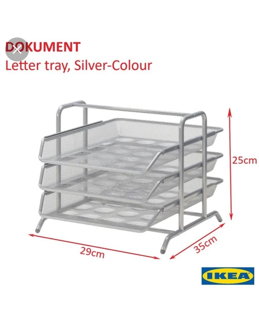 Selling a silver-coloured IKEA DOKUMENT letter tray! It's perfect for organizing your documents and keeping your workspace tidy. The dimensions are 29cm x 35cm x 25cm. It's in great condition and ready to use