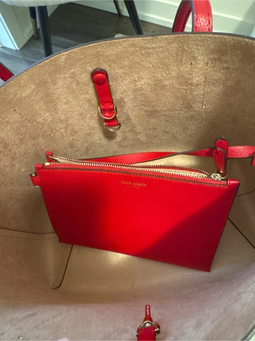 Barely used and in excellent condition — no major wear, stains, or scuffs. Structured shape with long shoulder straps and includes the matching zip pouch.