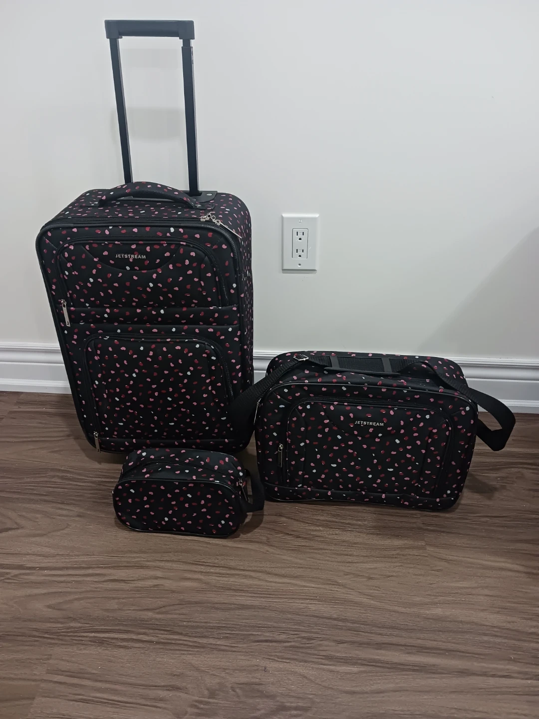 This Jetstream luggage set includes a suitcase, a carry-on bag, and a cosmetic bag. All pieces feature a black base with a pink and white petal pattern. They're made of durable fabric for travel. Used once