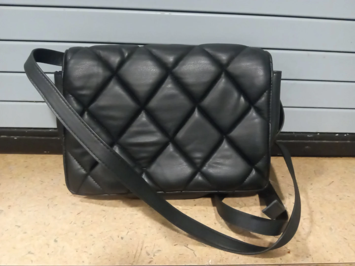 A black quilted shoulder bag. It's made of faux leather and has a secure closure. This bag's the perfect size for essentials!