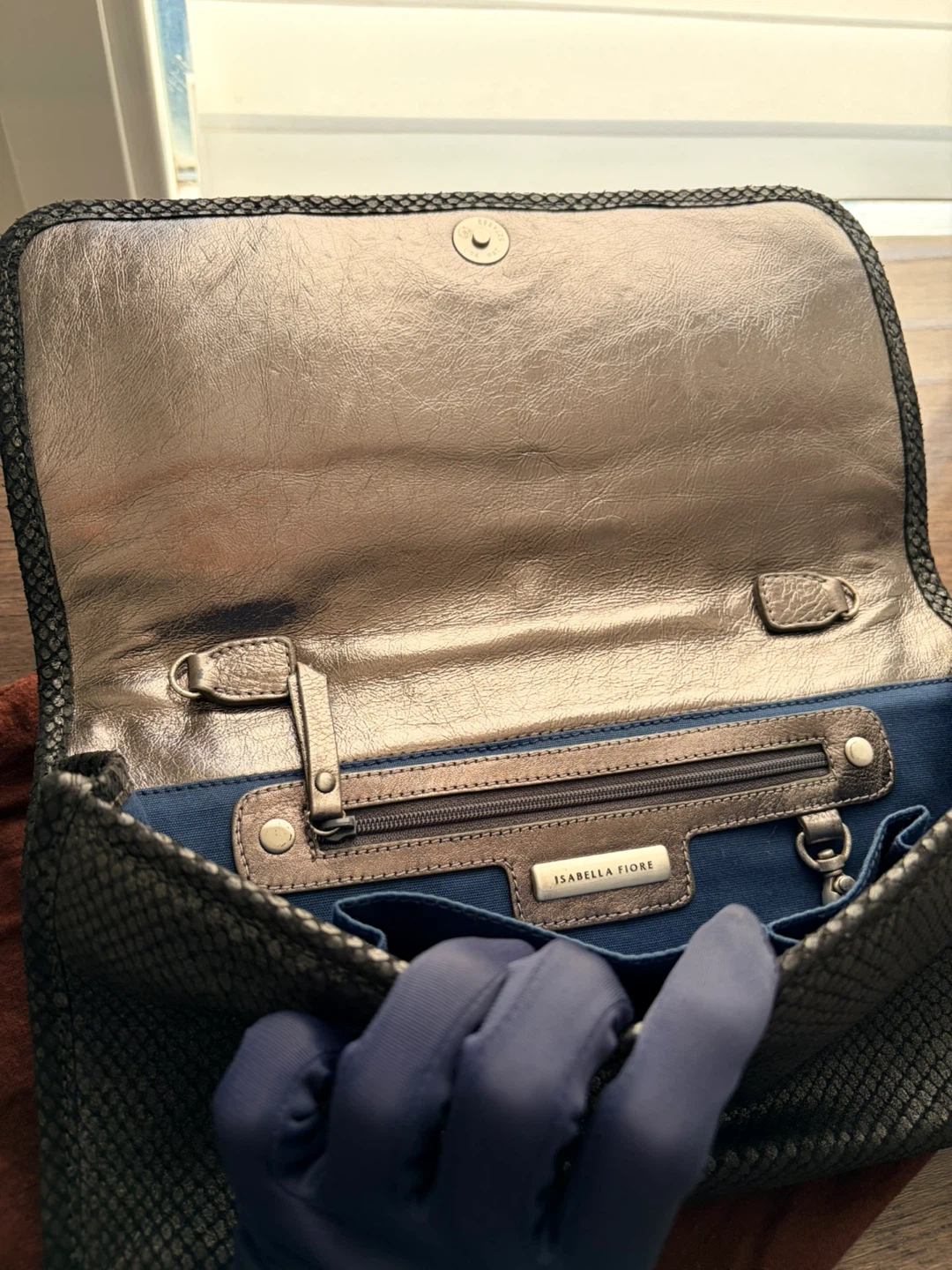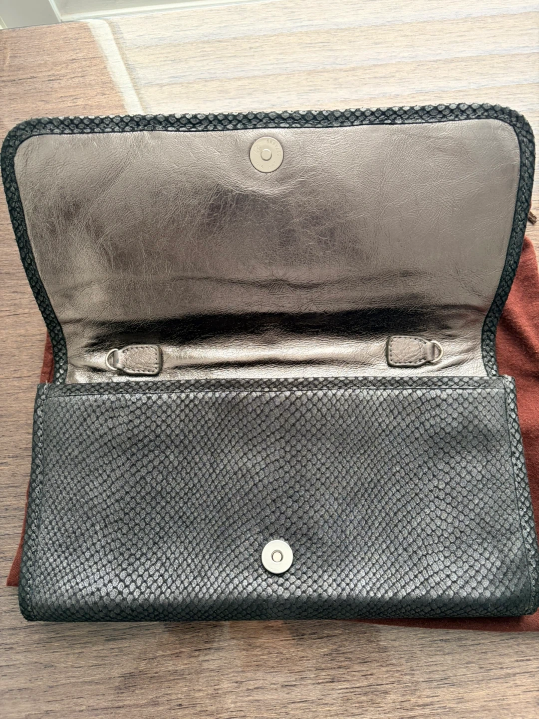 This Isabella Fiore clutch features a metallic snake print exterior with geometric accents. It has a secure snap closure and an interior zip pocket. The metallic lining adds a touch of glam! Comes with dust bag. 11.5” x 6.5” x 1.5”. Never used, mint condition.