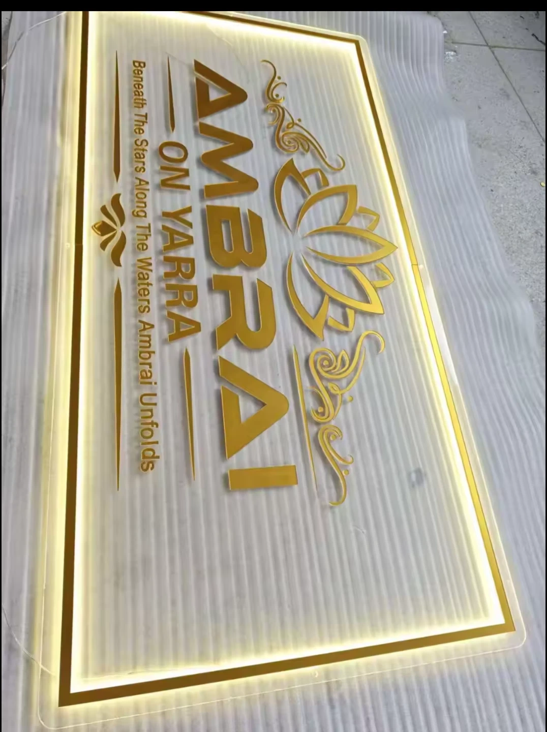 This is a custom illuminated signage for "Ambrai On Yarra". It features golden color lettering and a lotus design. The sign is backlit with warm LED lights for a striking visual. Measures approx. 3 feet by 2 feet. Perfect for a business entrance or feature wall!