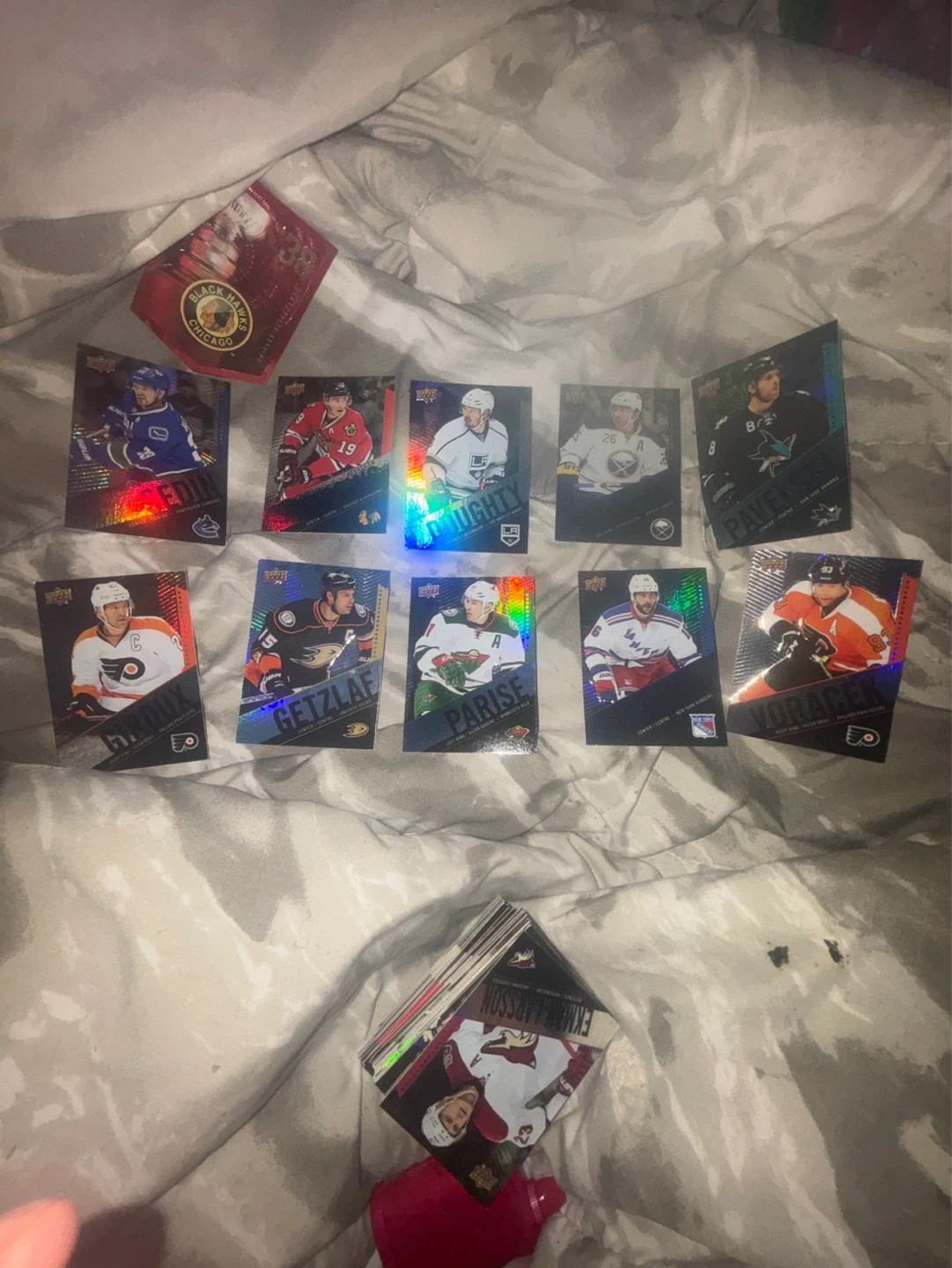 A collection of Upper Deck NHL hockey cards featuring various players. Includes cards of Getzlaf, Parise, Voracek, and others. Cards are in good condition.