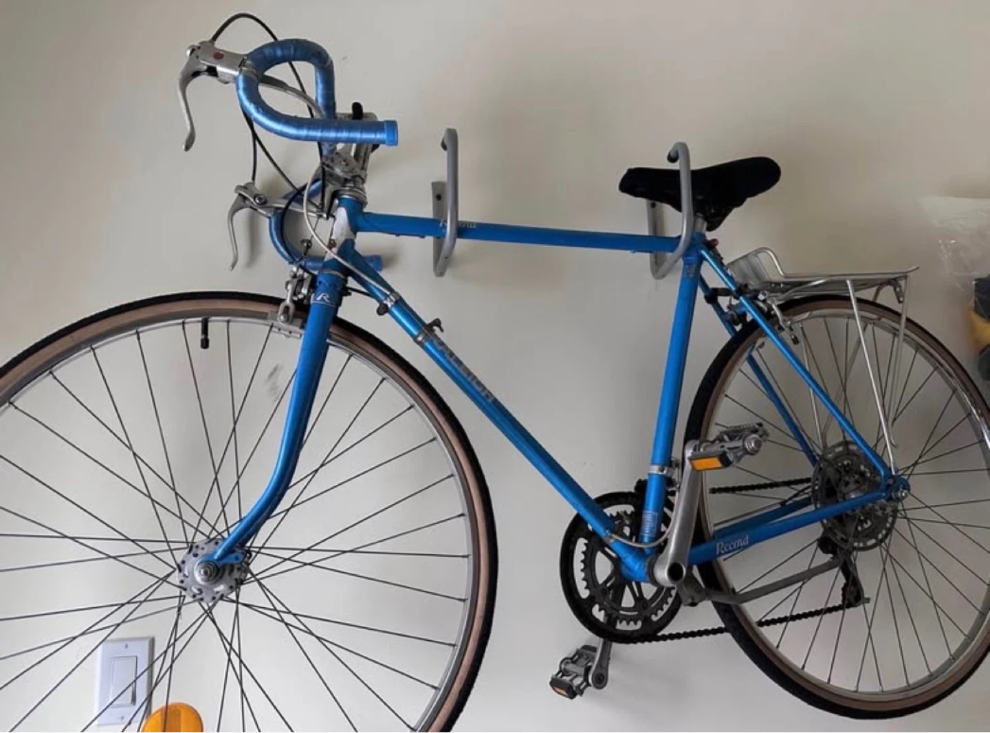 Blue Raleigh Record road bike with drop bars. Features 27x1-1/4 tires and standard schrader valves. This bike was recently tuned up and had its front and rear tubes and brake cables replaced. It's ready for the road!