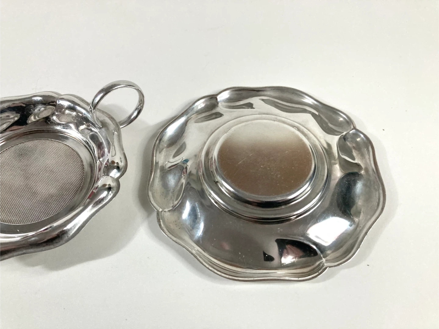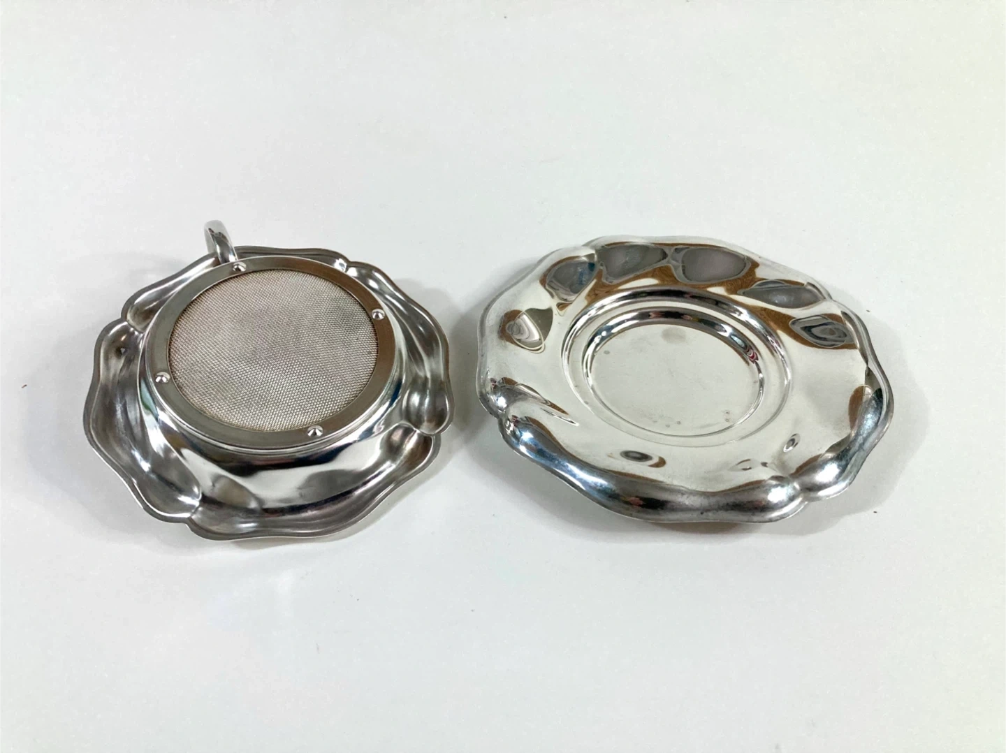 Vintage silver-plated loose leaf tea strainer with a scalloped floral rim and a matching tray. Unmarked not sure of date of origin. There is some minor wear and scuffs on the plating and slight tarnish due to previous use and age. Otherwise very good condition.