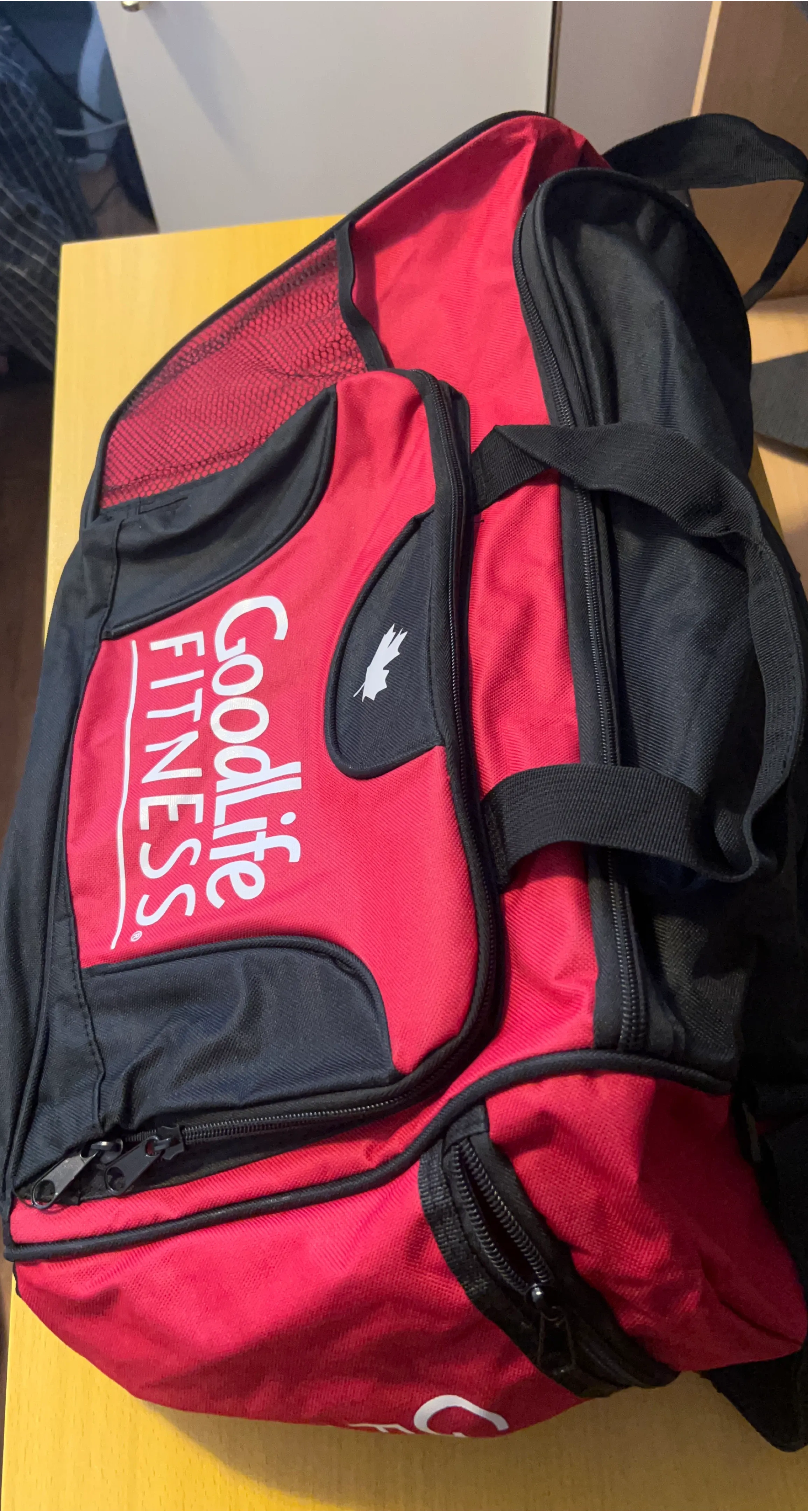 This is a Goodlife Fitness duffle bag. It's red and black with a mesh pocket and multiple zippered compartments. It's a great bag for carrying gym clothes or other essentials!