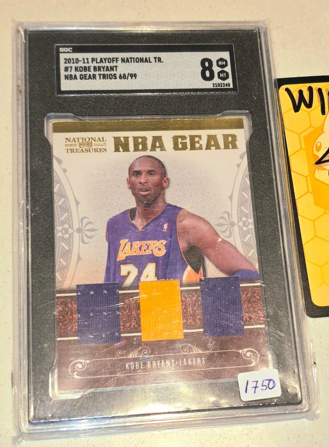 This is a 2010-11 National Treasures NBA Gear Trios trading card for Kobe Bryant. It's graded 8.5 NM-MT by SGC. The card features game-worn jersey patches from the Lakers player.