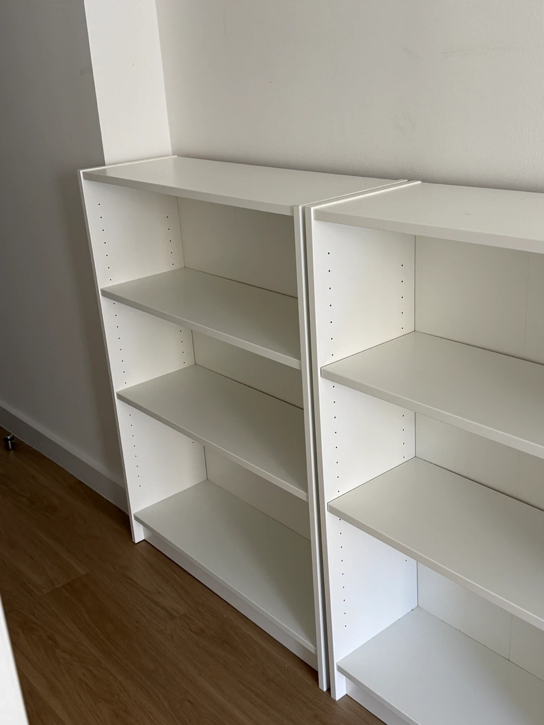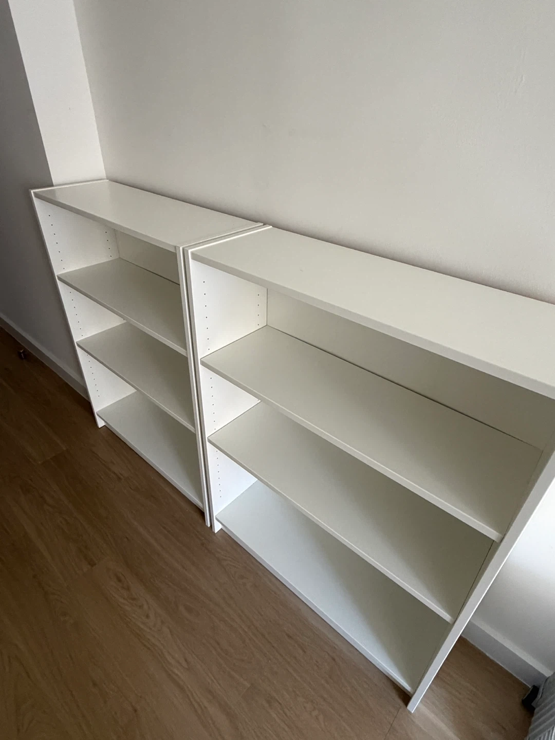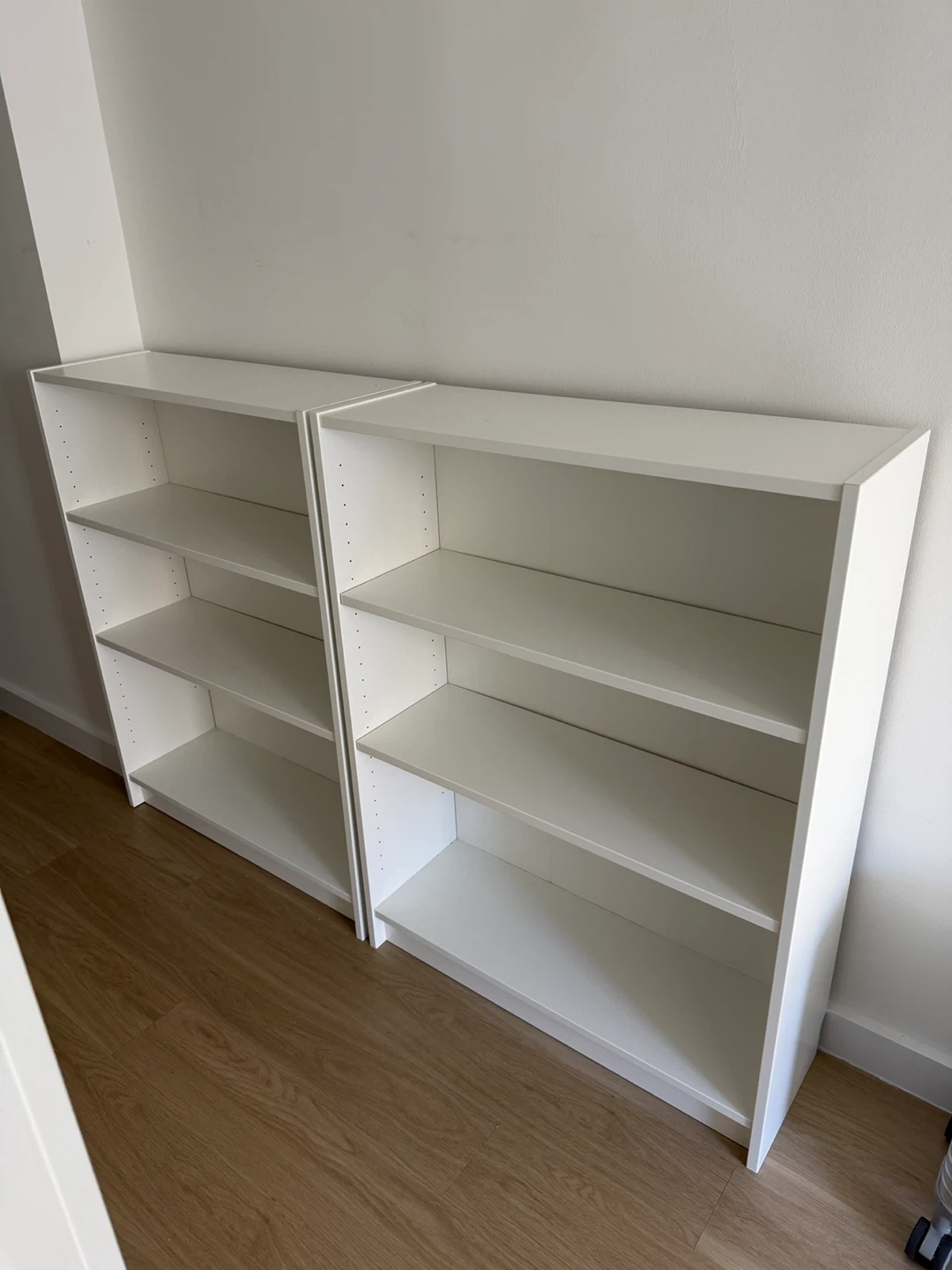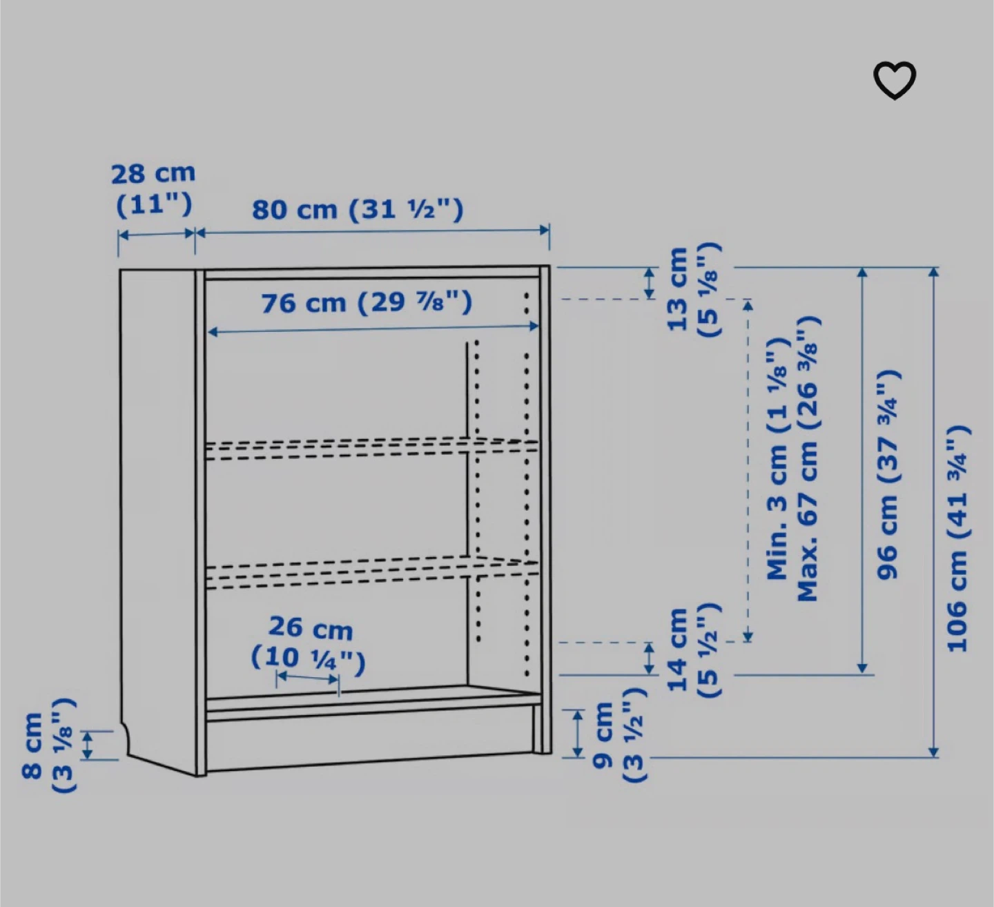 White BILLY bookcase. Dimensions are 31 1/2" wide, 11" deep, and 41 3/4" high. This unit offers adjustable shelves for versatile storage. It's a classic and practical storage solution!