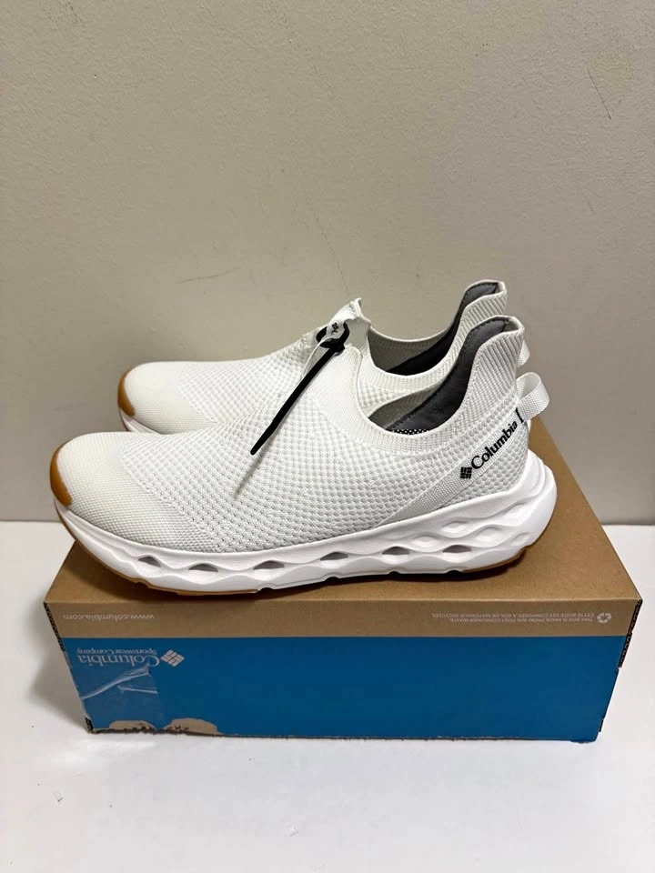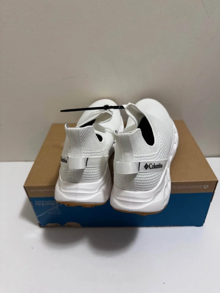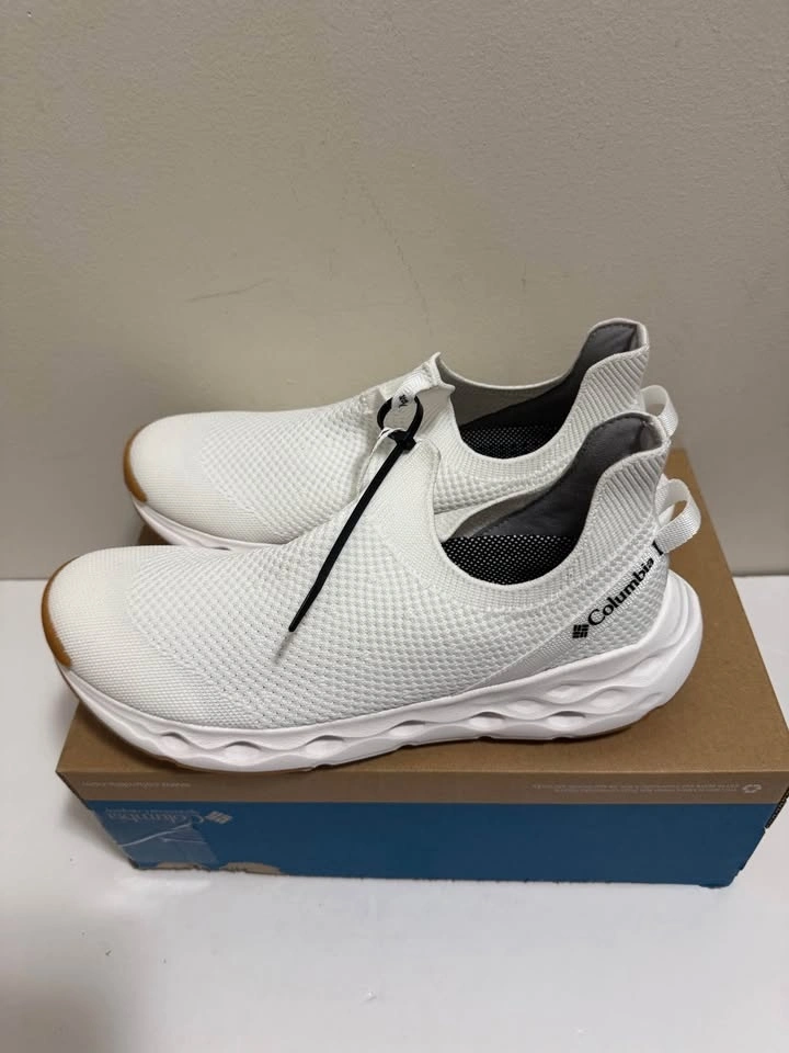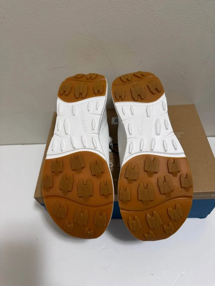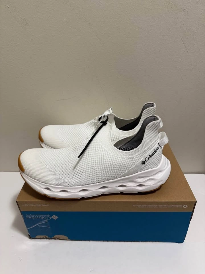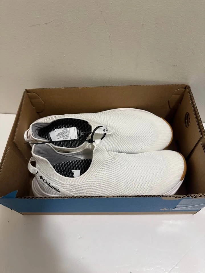 Fresh Columbia white slip-on shoes with a knit upper. White soles with brown accent at the toe and heel. Comes in the original box. Pick up only. Located near Brampton Gateway Terminal and Shopper World Mall Brampton. Address provided upon scheduled pickup confirmation. Cash only.