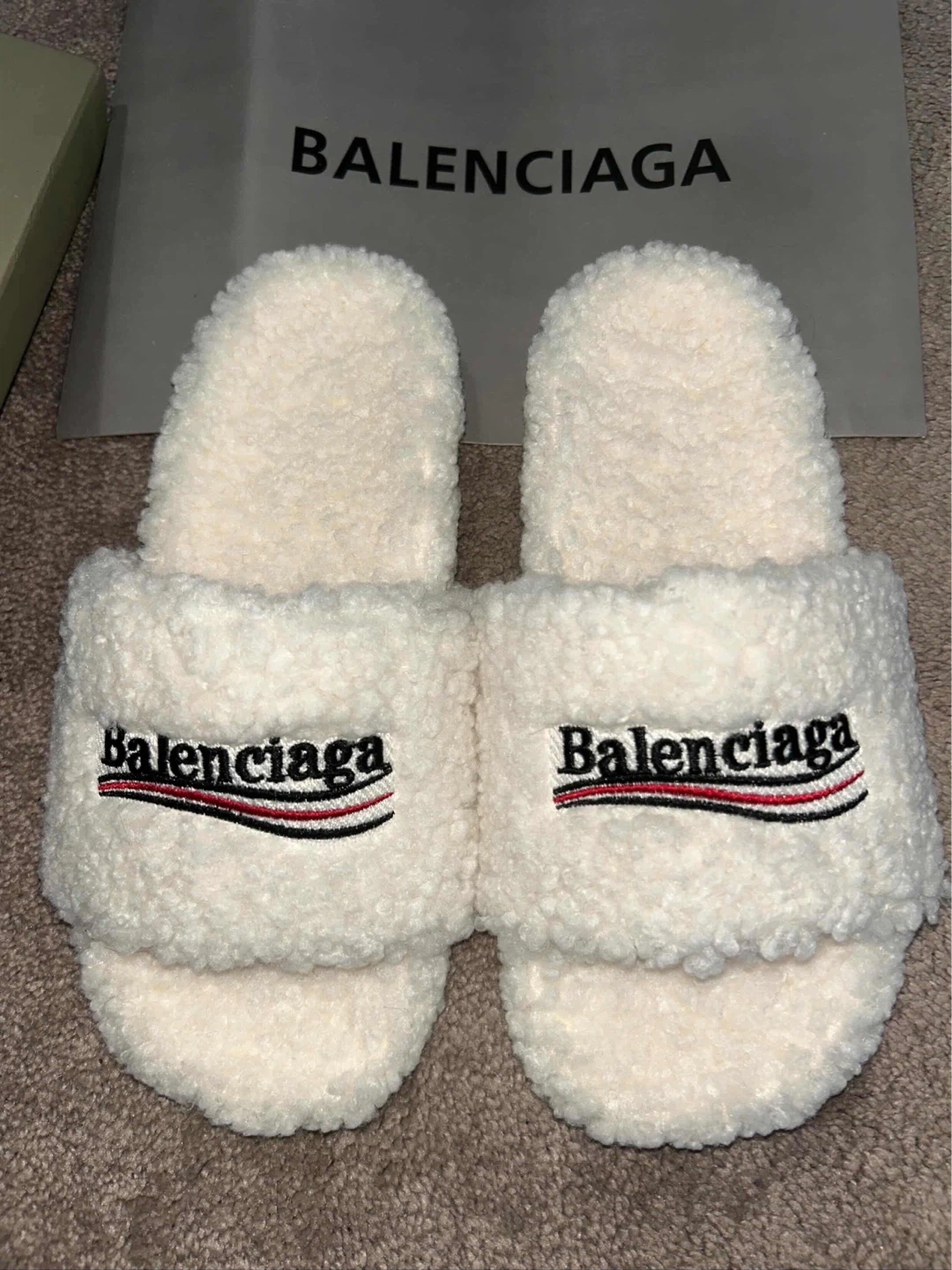 Balenciaga fuzzy slippers in white with embroidered logo. Comes with original box and dust bag. Comfortable and stylish for lounging.