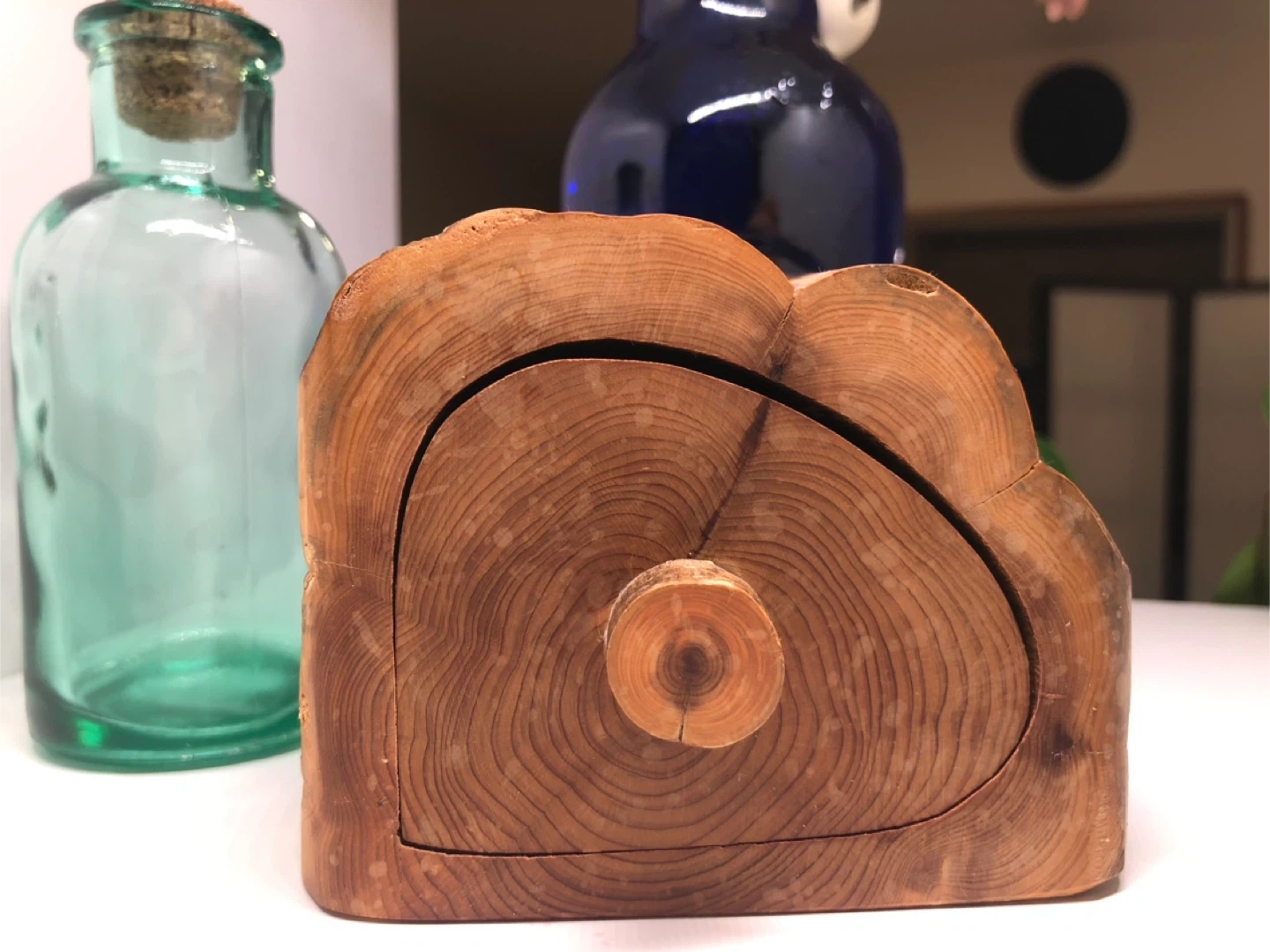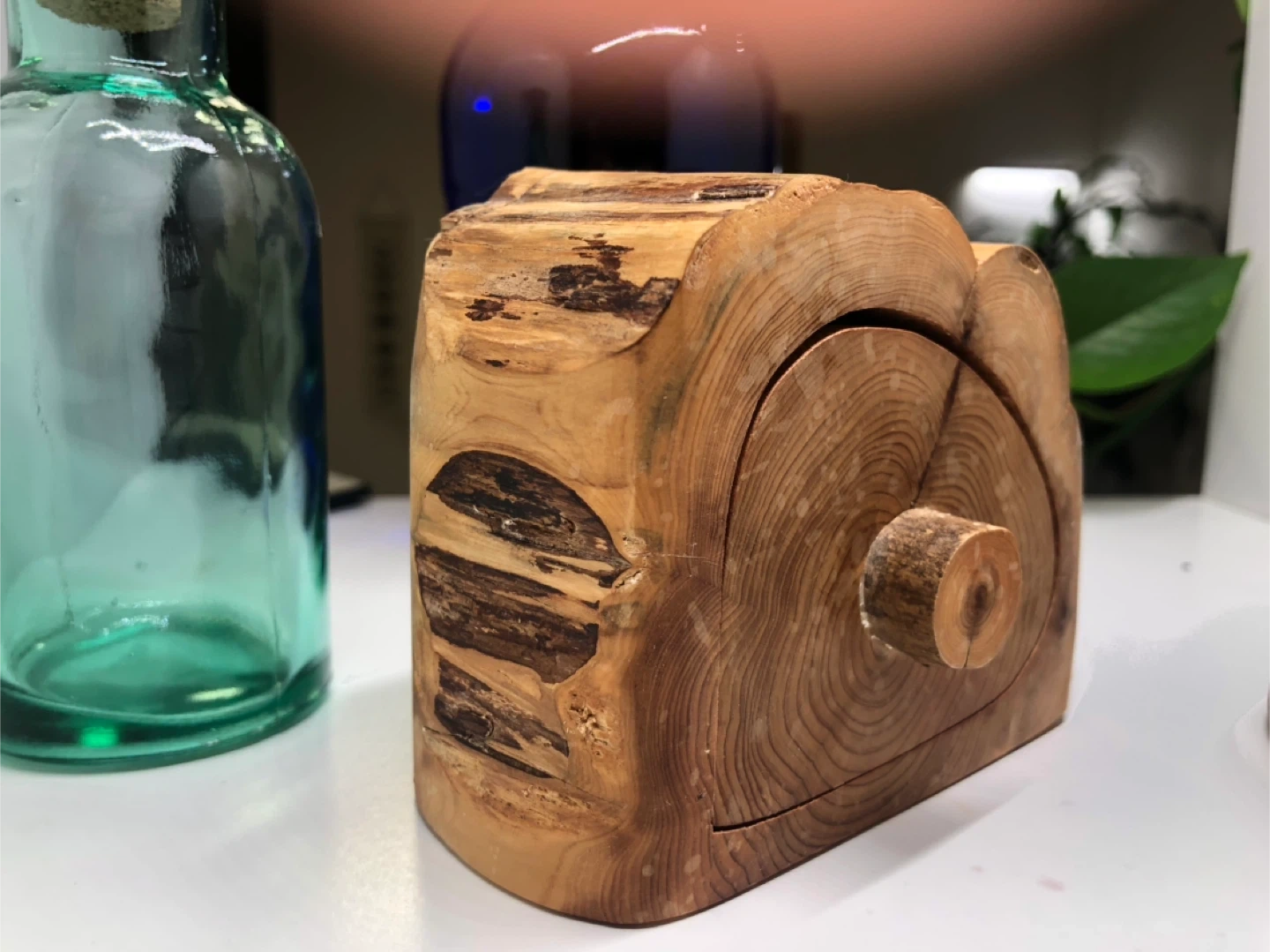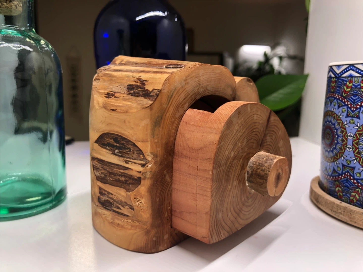 A unique, handmade wooden box. It's a great decorative piece and can be used to store small items. The wood grain is beautiful and adds a natural touch to any space