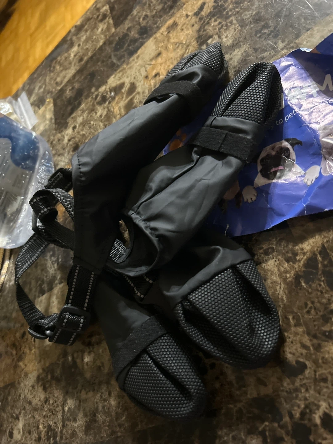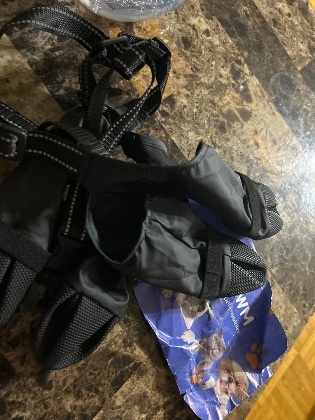 I’m selling a new Set of four black dog boots with adjustable velcro straps. These boots are made of durable nylon and have rubber soles for protection. Ideal for protecting paws from hot pavement, ice, or rough terrain.