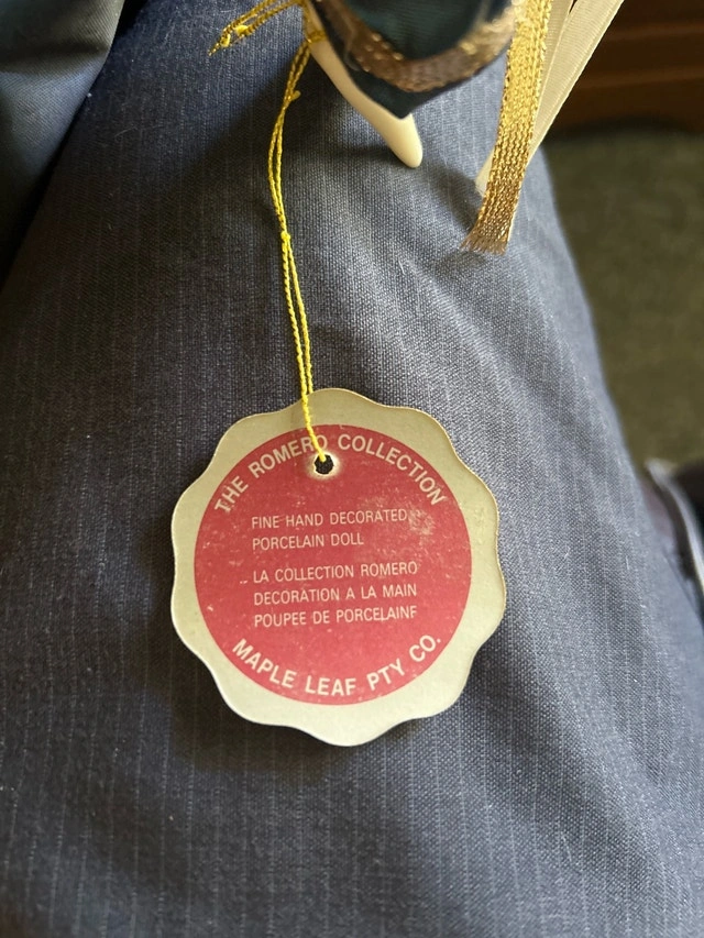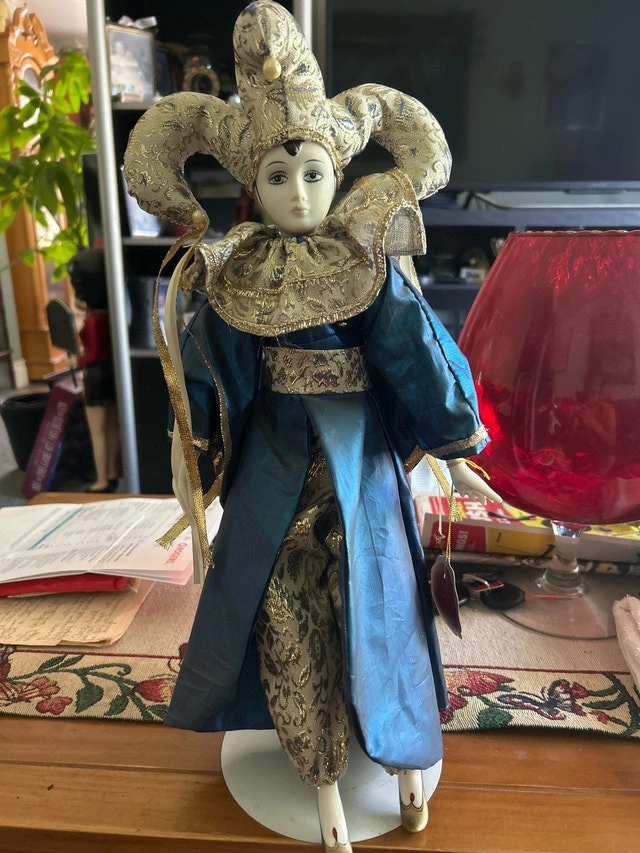 This pre-owned Romero Collection porcelain doll showcases a beautiful blue and gold jester outfit. It's a unique piece with fine, hand-decorated features. A charming addition to any doll collection! If the ad is up, the doll is available. Cash accepted.