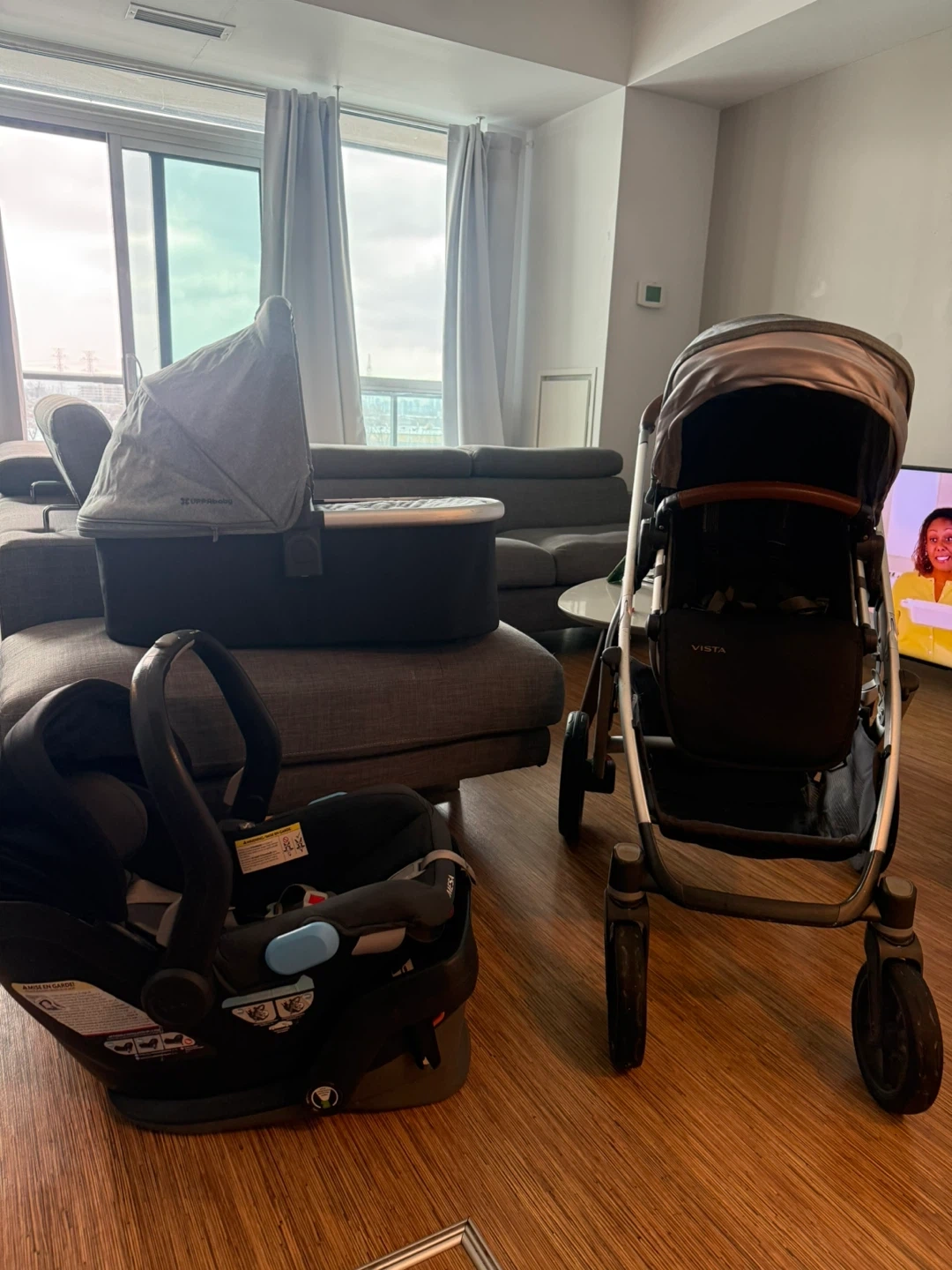 This UPPAbaby Vista travel system includes a stroller and a MESA infant car seat. The stroller features a reversible toddler seat and a bassinet attachment. It's in a neutral grey colour. This set is great for getting around with your little one!
