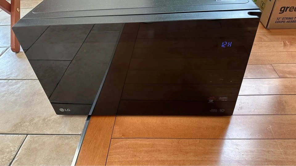 Modern LG microwave oven, model LMC1575SB. Features Smart Inverter technology for even cooking. Sleek black finish with a glass front. Includes a glass turntable. 1200W power output. Great for any kitchen. Public pick up at Summit Park.
