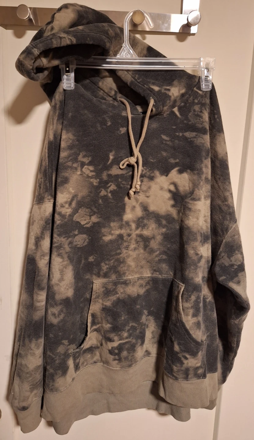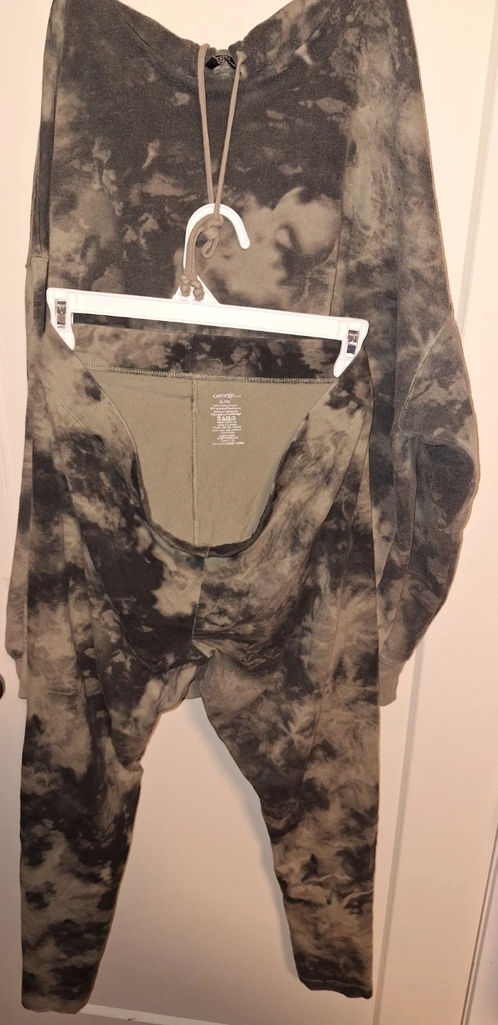 Selling a comfy George hoodie and leggings set in size XL. The set features a unique tie-dye pattern in grey and black. Perfect for lounging around the house or running errands! There are little fuzzies here and there on the set but still in great condition. No holes, No rips.