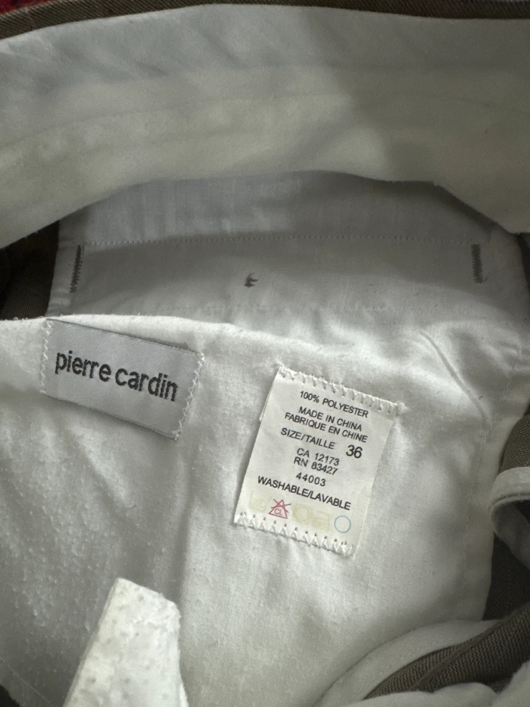 These Pierre Cardin dress pants are made from 100% polyester. They feature a subtle plaid pattern and a size 36 waist. Washable for easy care.
