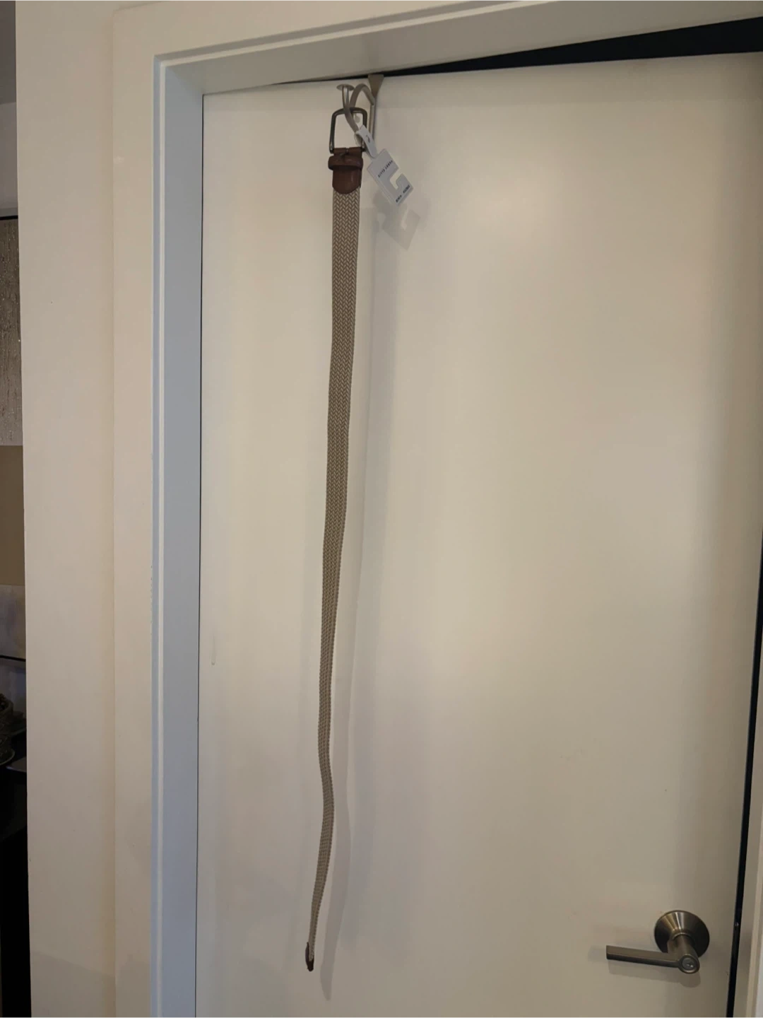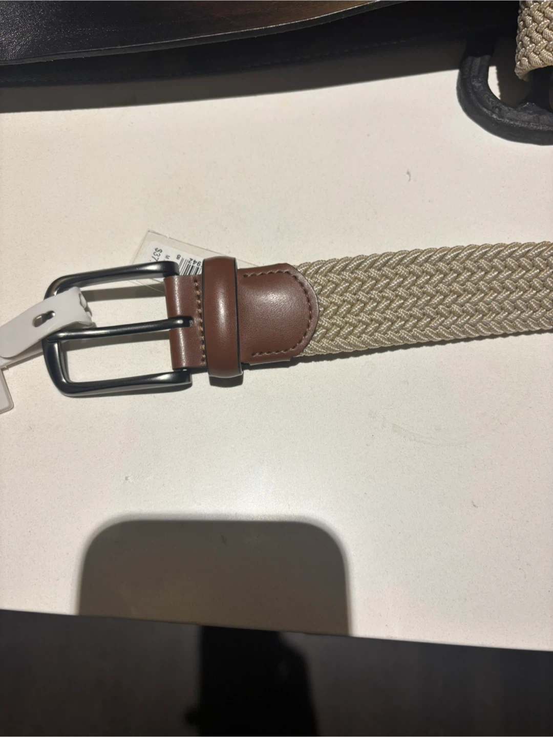 A woven elastic belt with a brown faux leather trim and buckle. It's a stretchy, comfortable accessory for everyday wear. The neutral colour makes it easy to pair with various outfits.