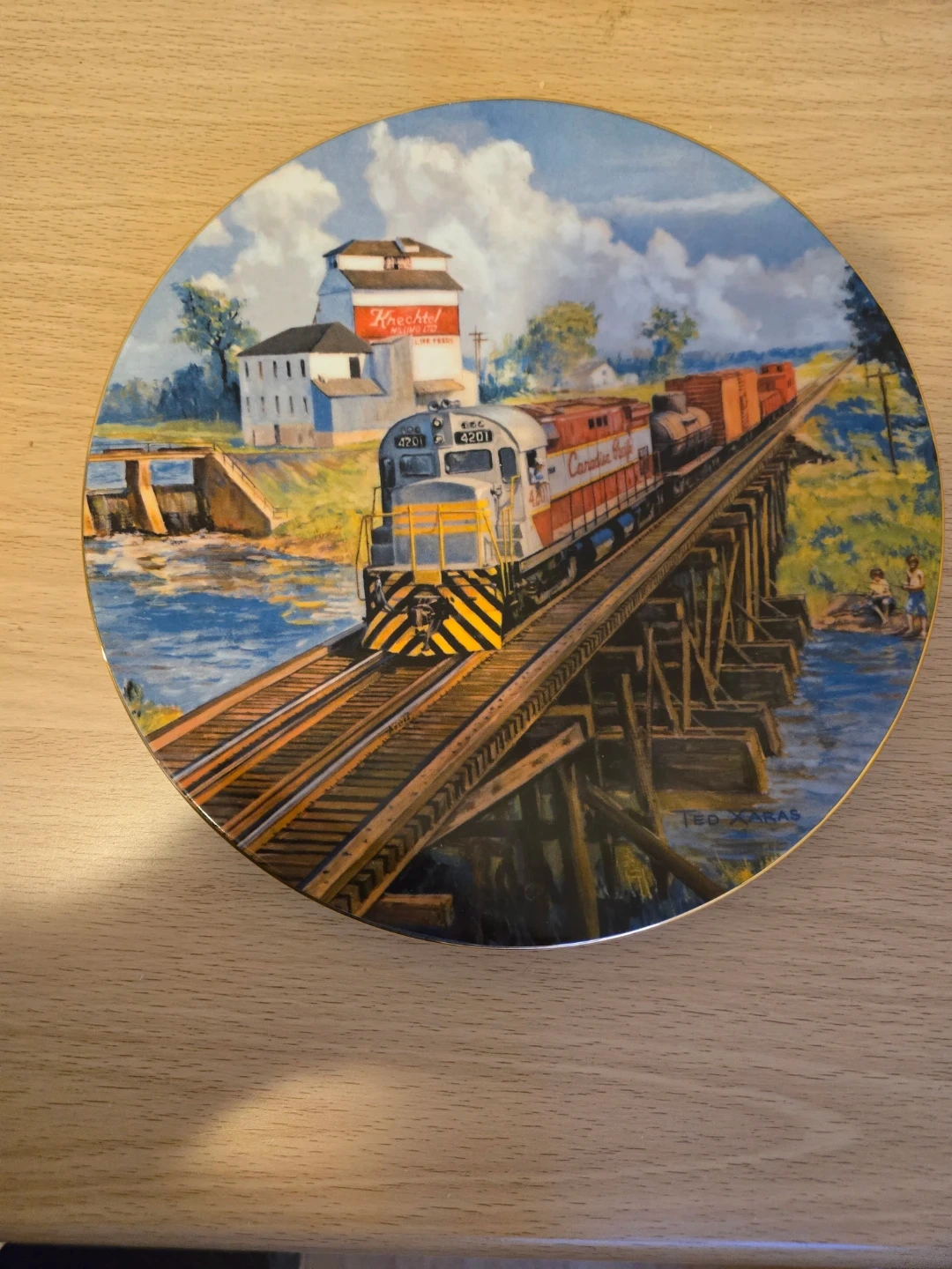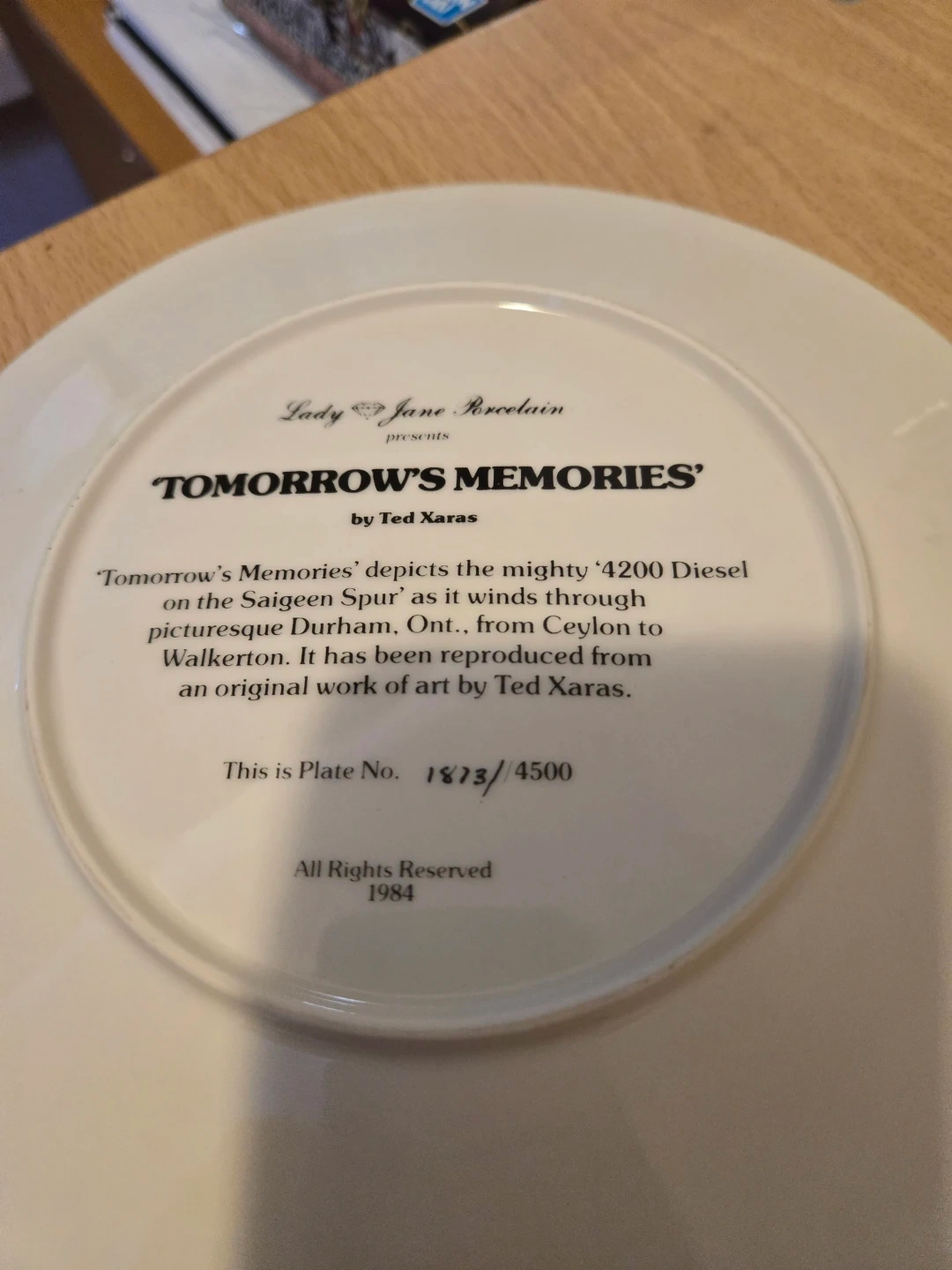 Lady Jane Porcelain presents "Tomorrow's Memories" by Ted Xaras. This collector plate depicts the '4200 Diesel on the Saigeen Spur as it winds through picturesque Durham, Ont. It's been reproduced from an original work of art. This is Plate No. 1873/4500.