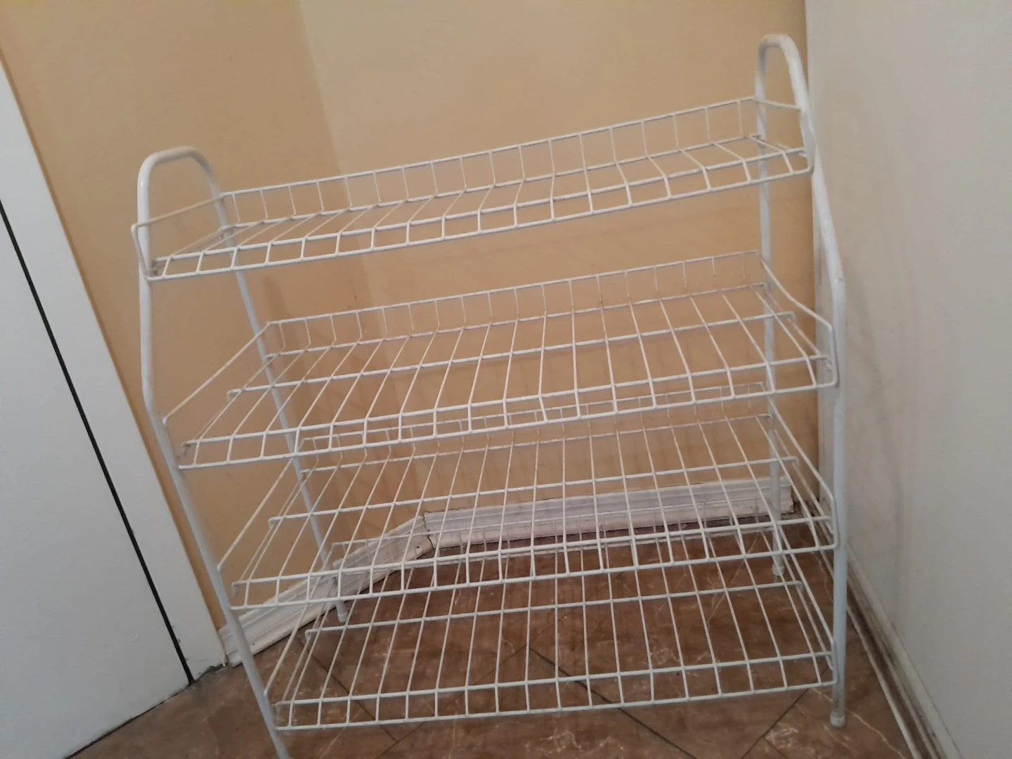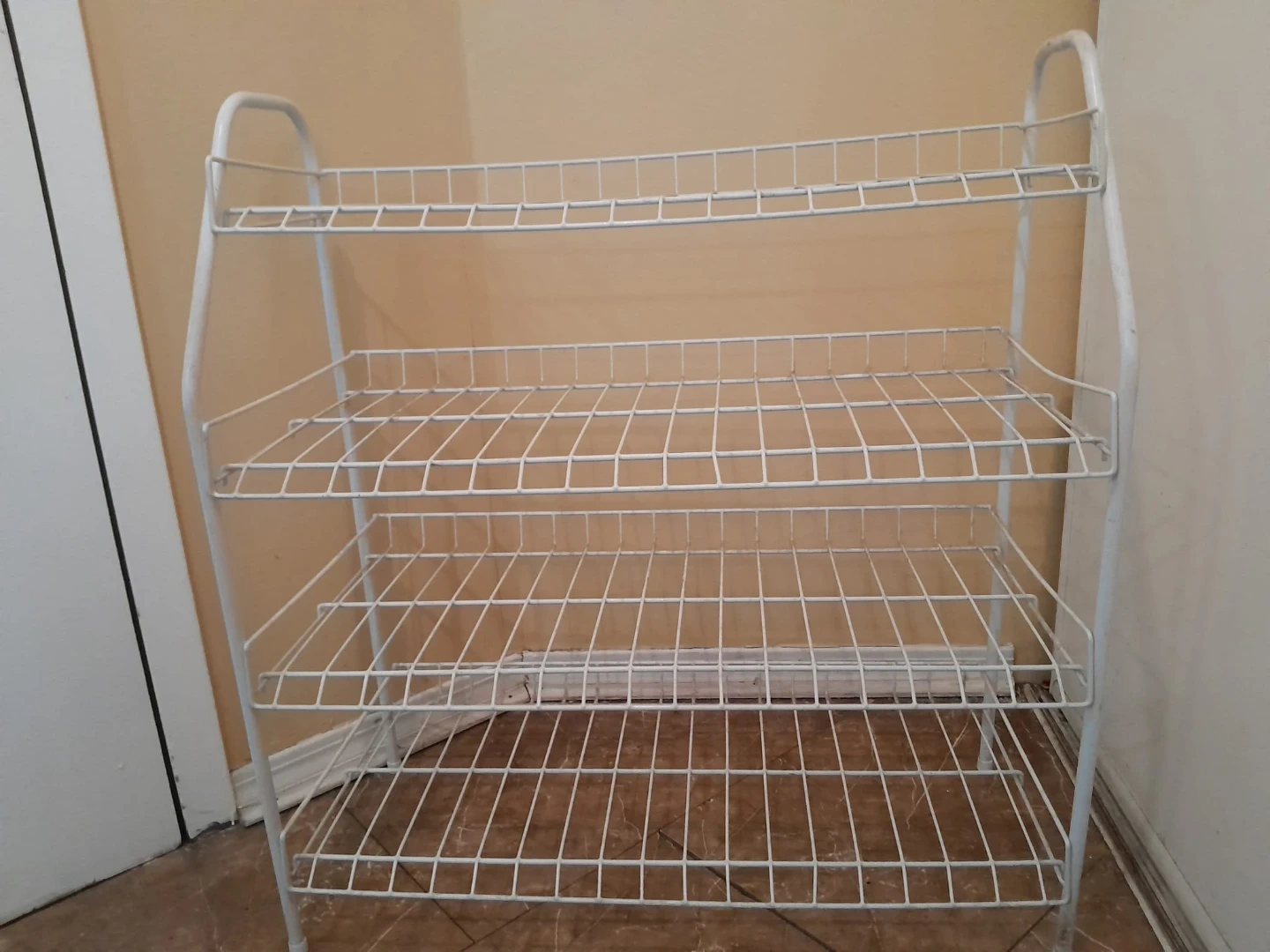 A metal shoe rack with 4 tier shelf on sale .Color white.In a good condition.No rust.Perfect for small spaces and easy to move around.Good for shoes or use it for any other small stacking household items ..Sturdy built.if interested plz msg for a pick up.