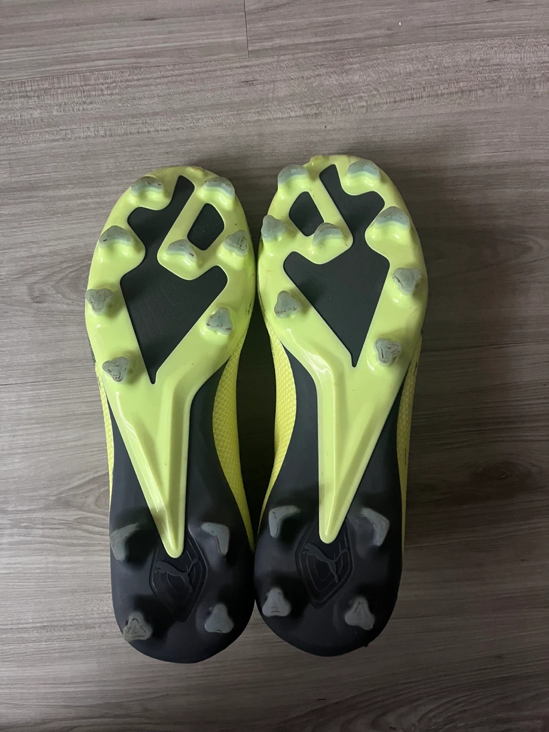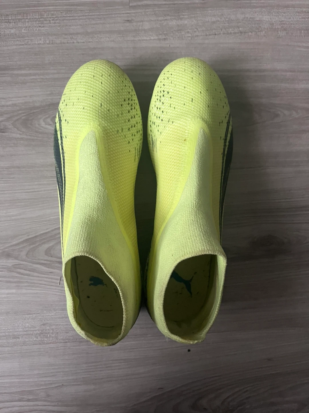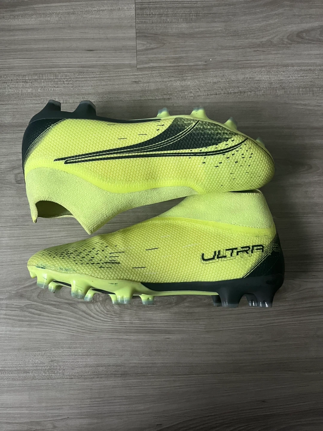 These are a pair of Puma Ultra firm ground soccer cleats in a bright yellow and black colourway. They feature a laceless design for a clean strike zone. These cleats are built for speed and agility on the pitch!