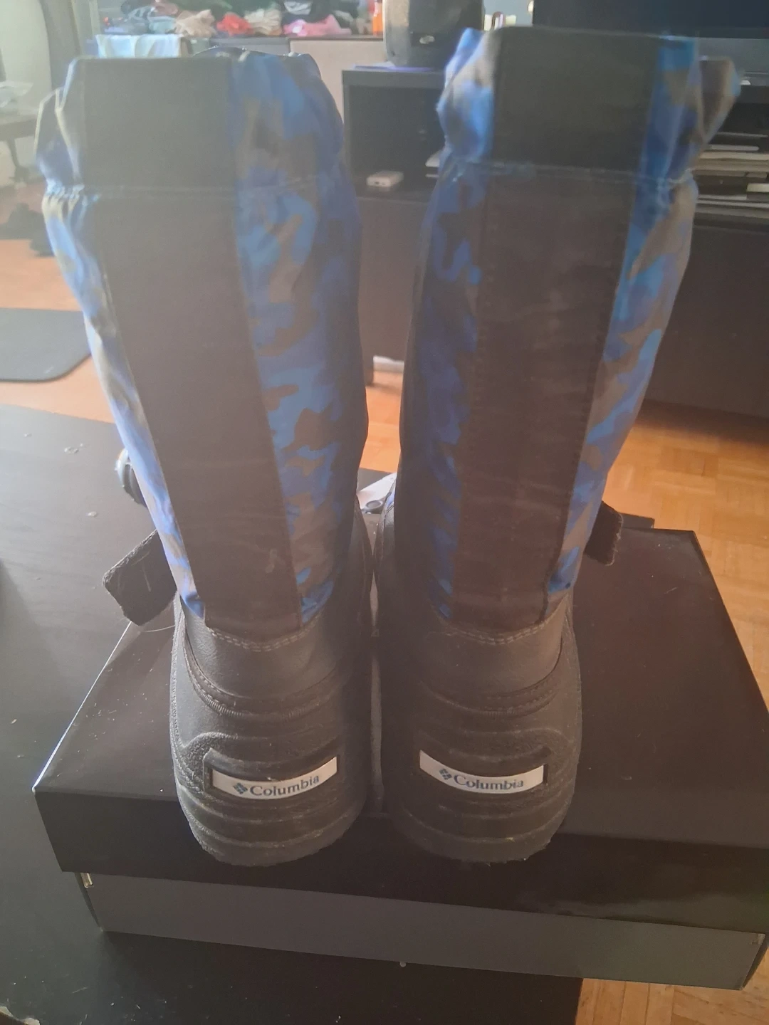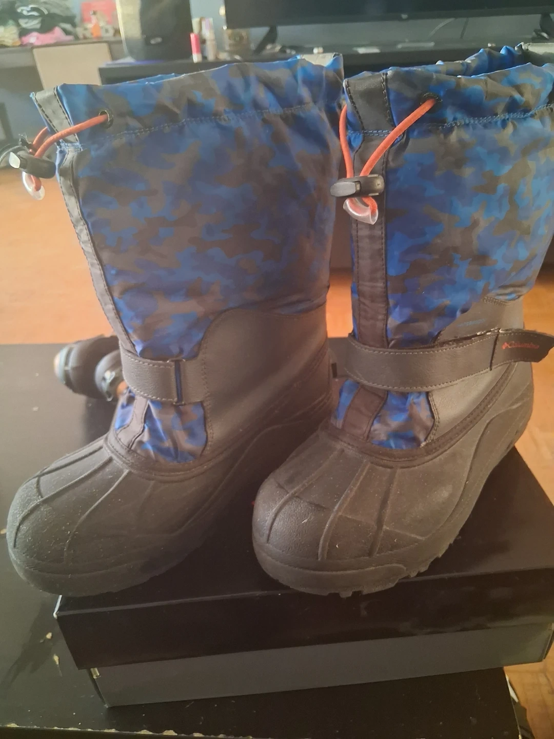 Youth Columbia snow boots in size 5 USA. These boots feature a blue and black camouflage pattern and a waterproof design. They're made to keep feet warm and dry during winter weather. Used 1-2 times. No box.