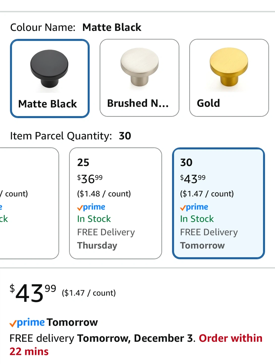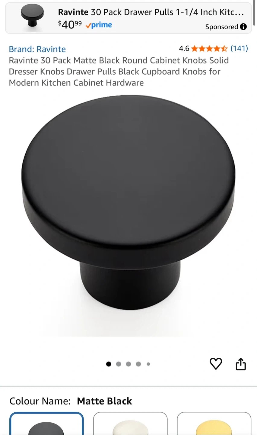 Selling a set of Ravinte cabinet knobs! This is a 30-pack of matte black round cabinet knobs, perfect for dressers, drawers, cupboards, or any modern kitchen cabinet hardware. Originally bought for $43.99, this set is still in its box and ready for your next home project