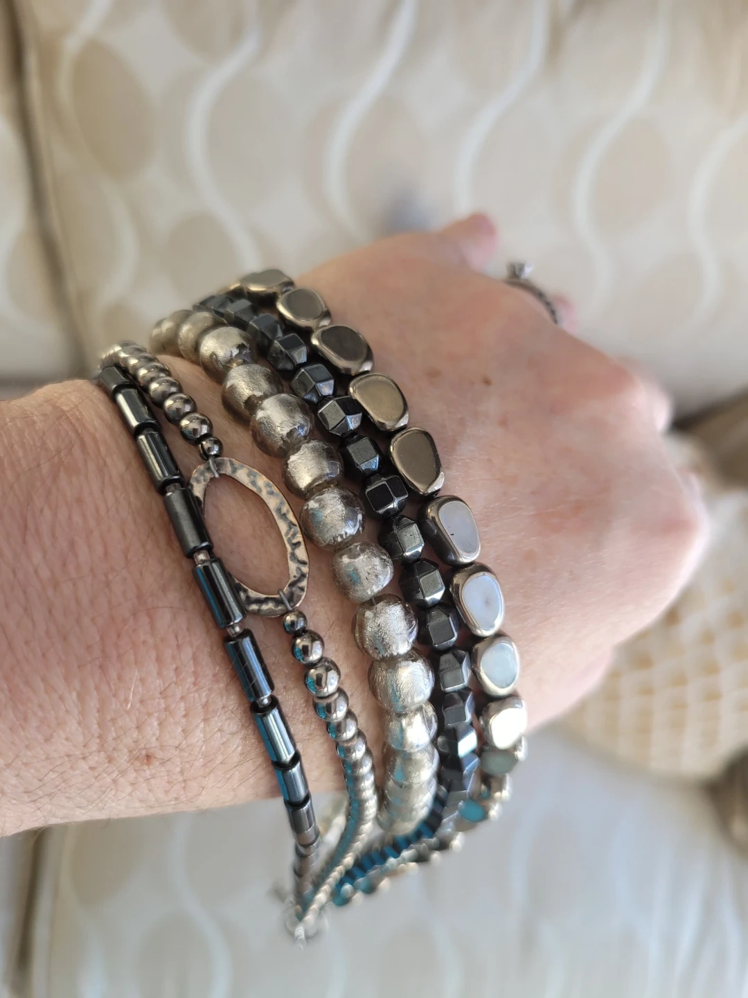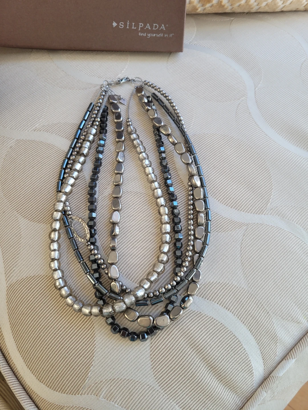 This Retired Silpada necklace features multiple 5 strands of mixed beads... Hematite, foiled glass Sterling Silver etc.