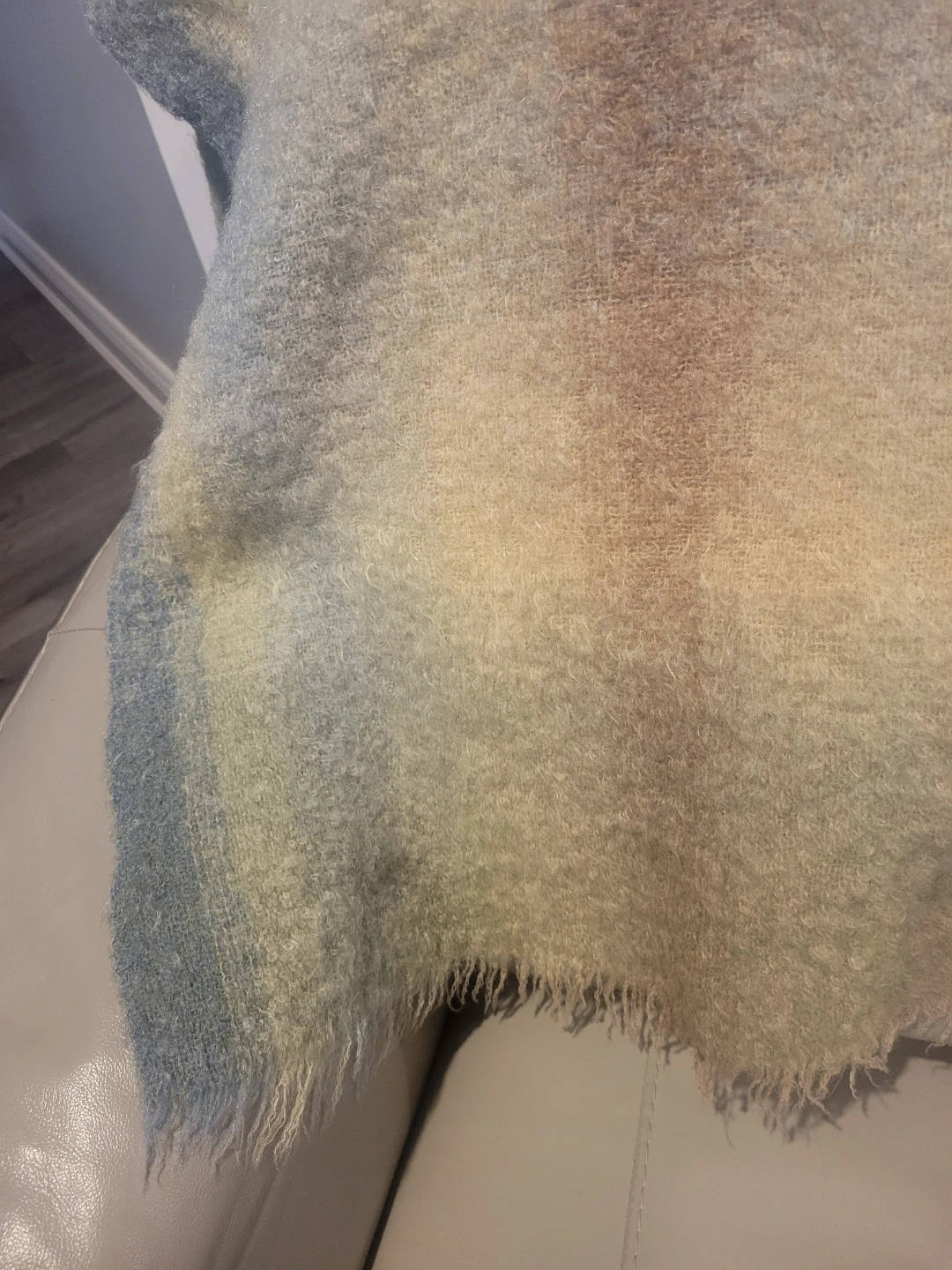 Wrap yourself in luxury with this elegant mohair blanket, showcasing a beautiful blend of pastel shades in a subtle striped pattern. This blanket is in used condition. The dimensions are 60" inches by 44" inches, perfect for adding a touch of warmth and sophistication to any room.