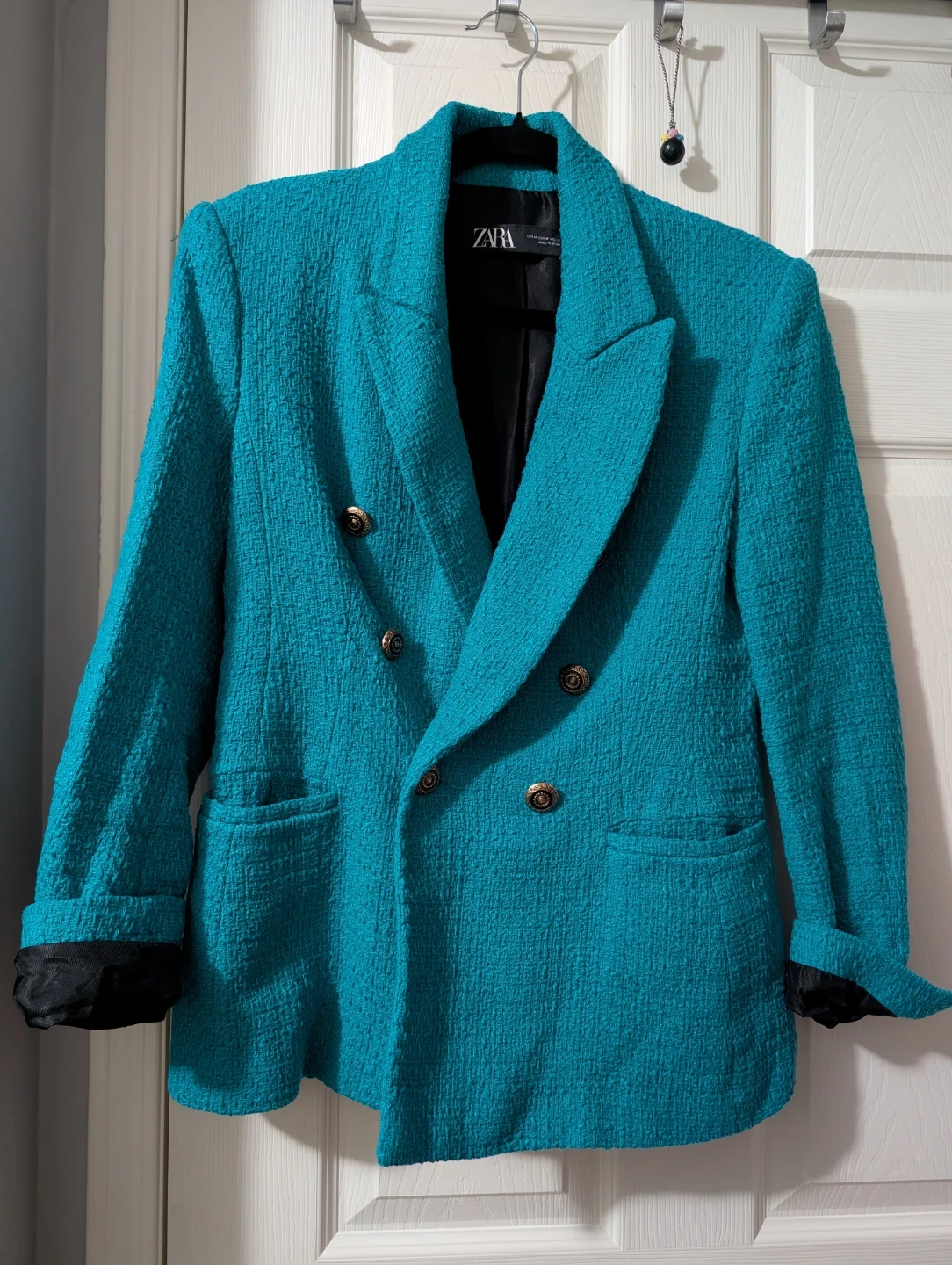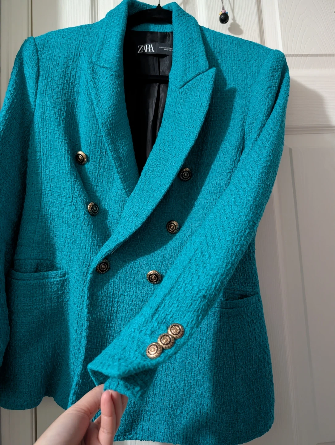 This teal tweed blazer from ZARA features a classic double-breasted design with gold-tone buttons. It has a textured fabric and a sleek black lining. The jacket includes two flap pockets on the front. A sharp addition to any wardrobe!