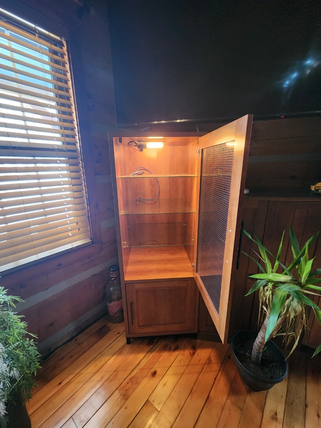 This wooden cabinet features glass and wire mesh doors, offering a unique display or storage solution. It includes interior lighting for showcasing items. Its versatile design makes it suitable for various home decor styles. 125.00 each