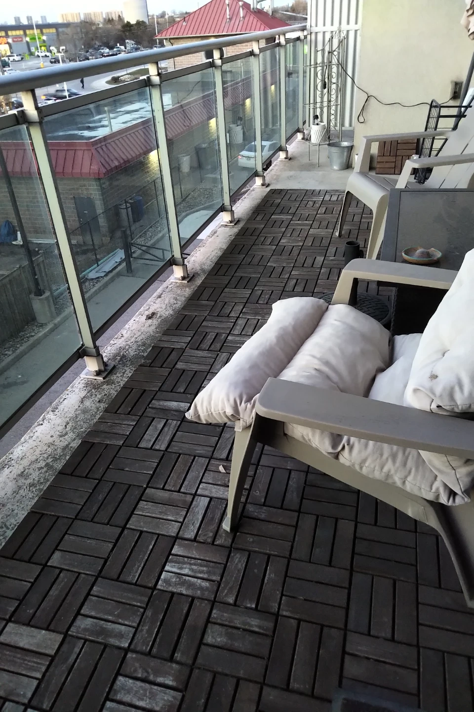 Dark wood interlocking deck tiles for outdoor spaces. These tiles are made from wood and are designed for easy installation on balconies or patios. They create a clean, modern look for your outdoor living area.