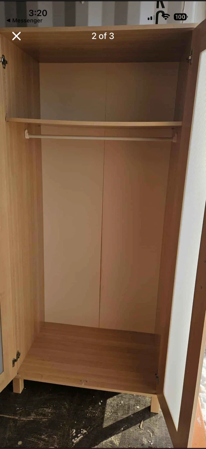 This is a wooden wardrobe with two doors. It's great for storing clothes and linens. It includes a hanging rod inside. This wardrobe would be useful for a bedroom or entryway!