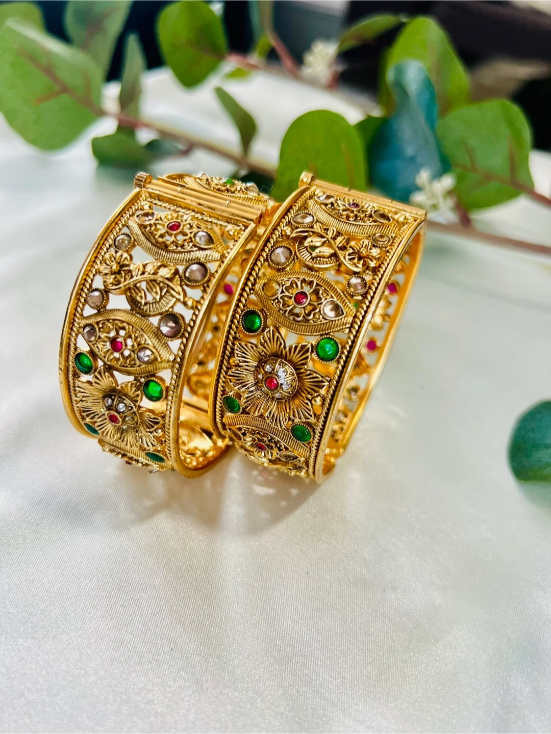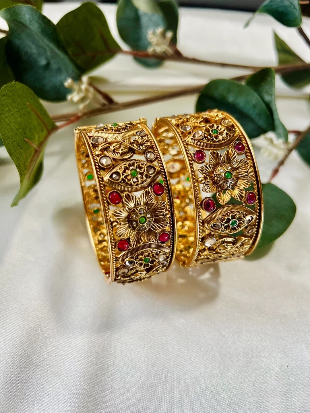 Set of two intricately designed gold-tone bangle bracelets. Each bangle features a detailed floral pattern embellished with small red and green accent stones, along with clear crystals. They're secured with a clasp closure.