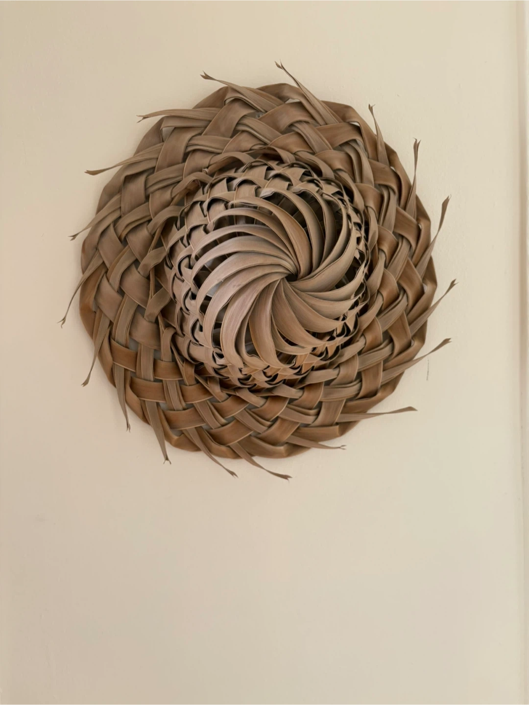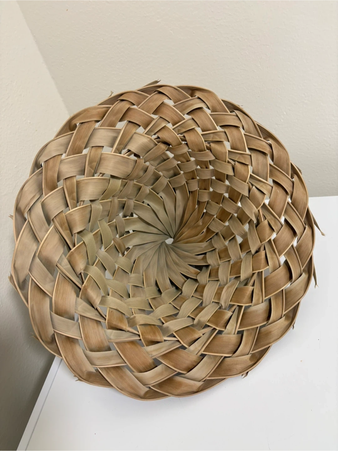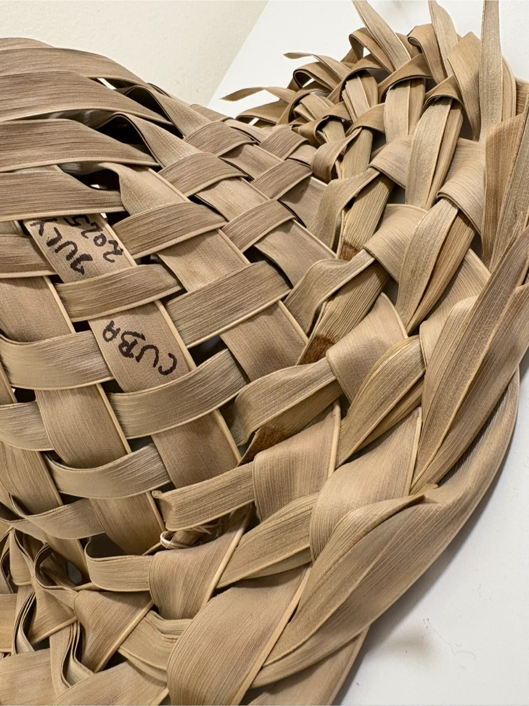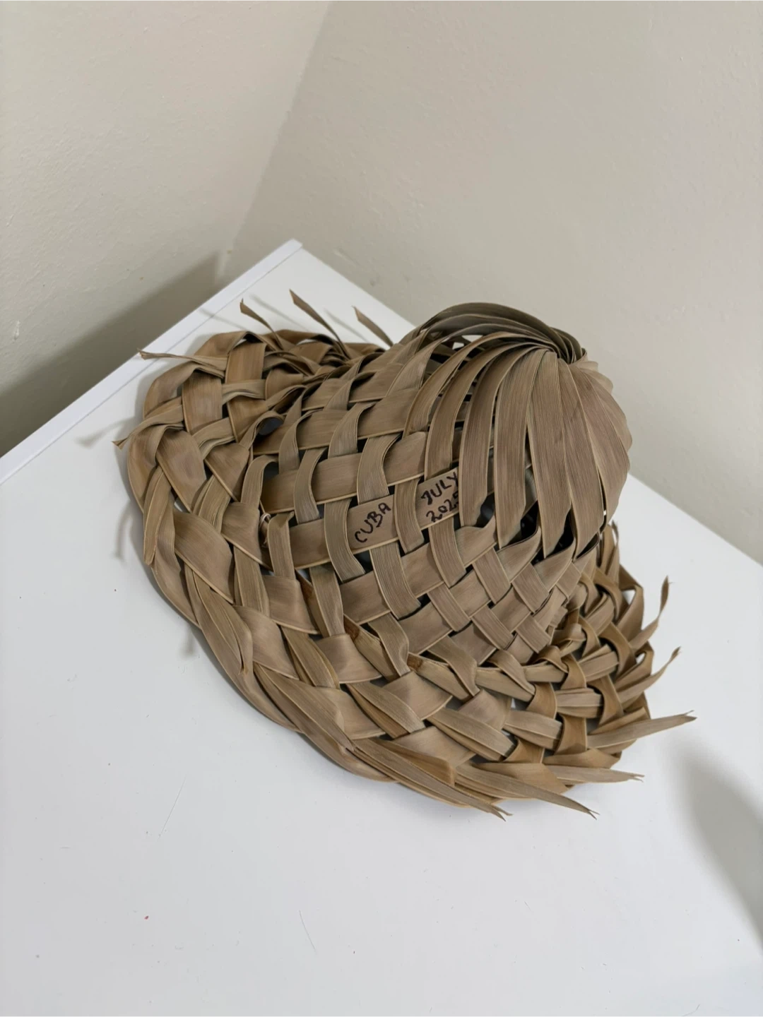 A unique, handwoven hat from Cuba, dated July 2025. It's made from natural palm leaves with a distinctive spiral weave. This hat makes a great decorative piece or a statement accessory.