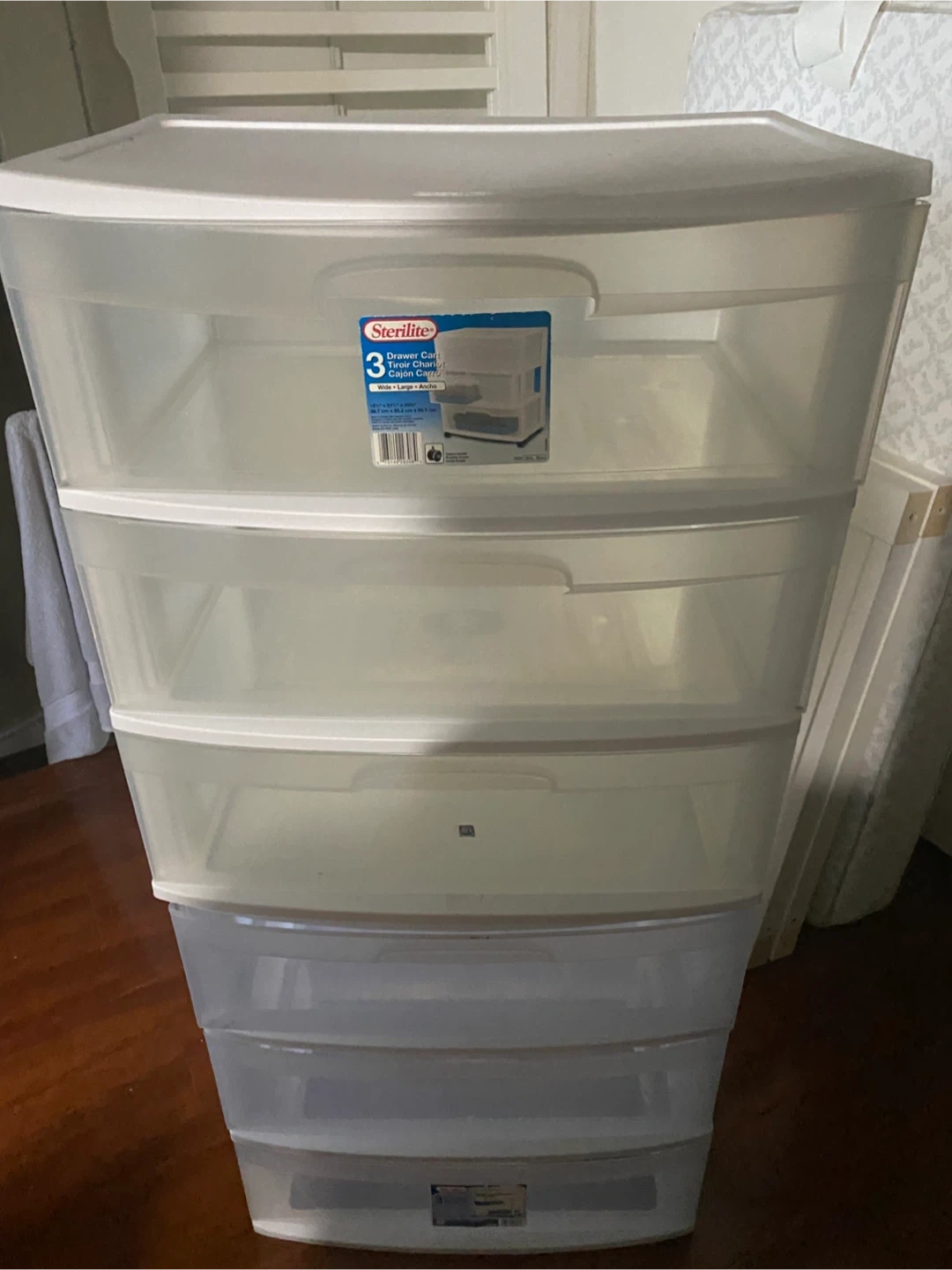 Sterilite 3 drawer wide cart. Clear plastic drawers on a white frame. Useful for organizing craft supplies or small household items.