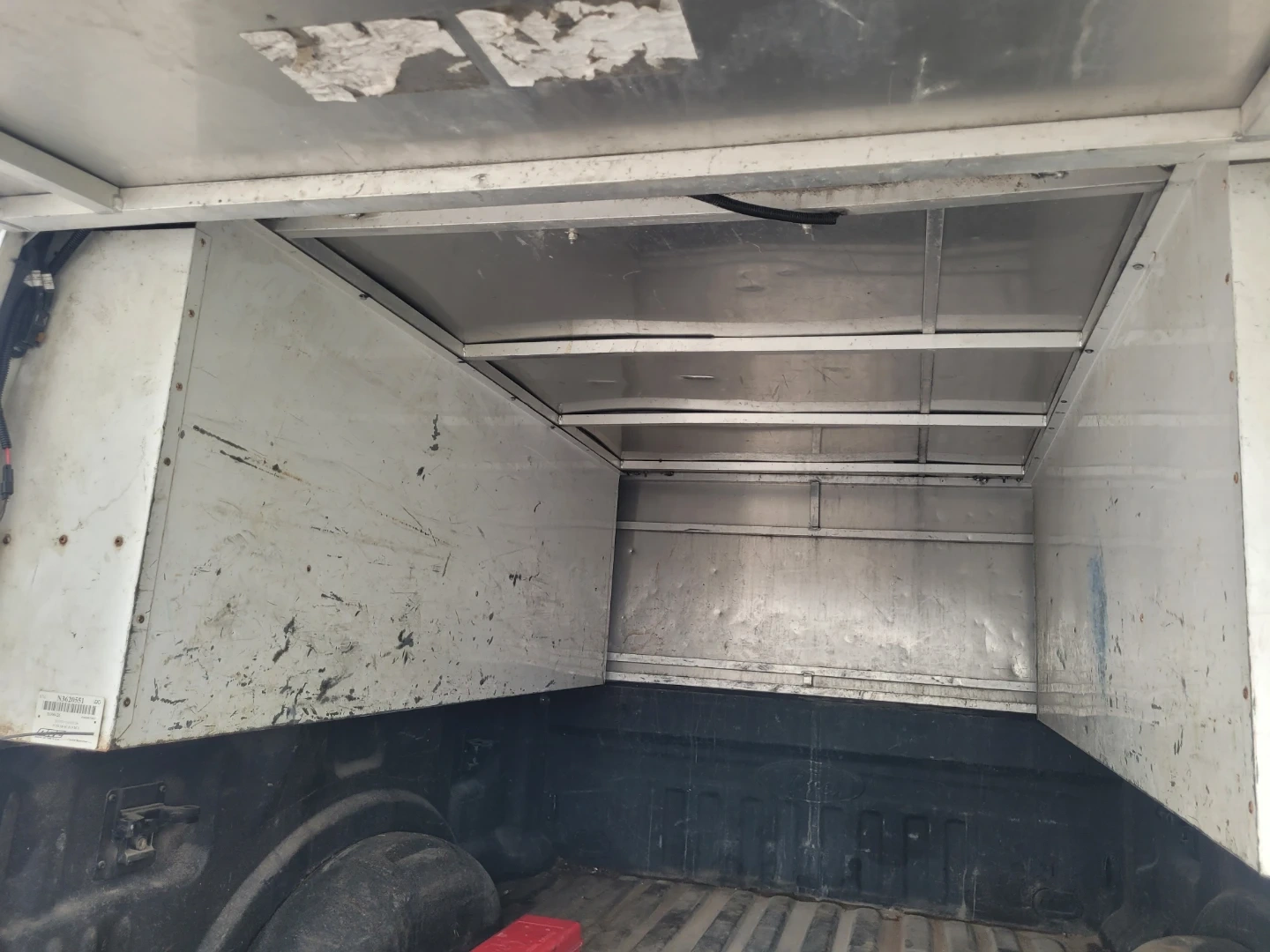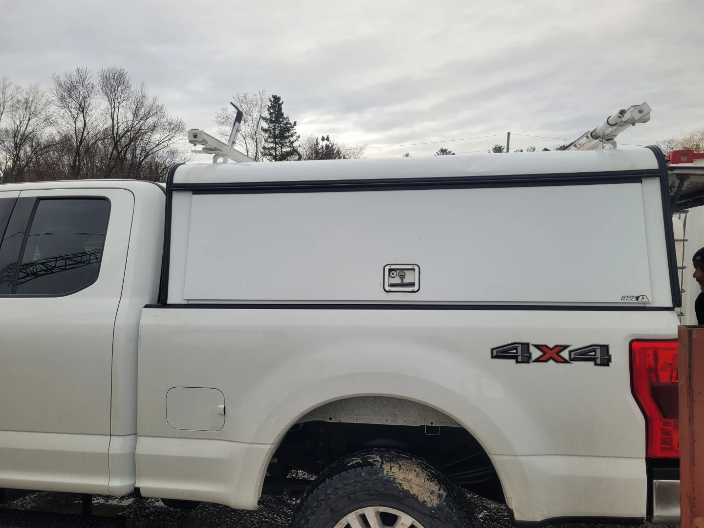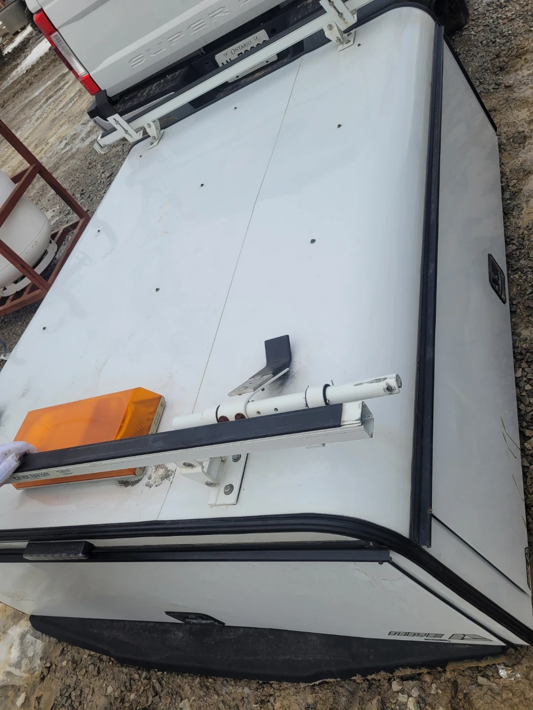 White truck topper with a built-in ladder rack and amber strobe light. Features side access doors and ample storage space inside. It's a durable solution for hauling gear. It's for a 6.75 box, and I did see something today on the tail gate door which would suggest it's for a Ford F250 and 350 only.