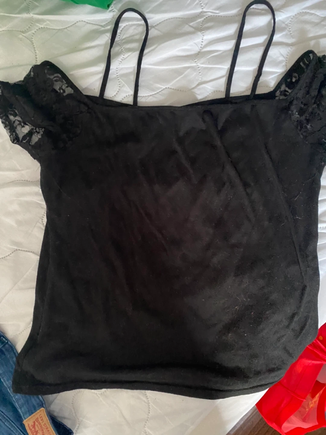 This black t-shirt features the classic Jack Daniel's Old Time Old No. 7 Brand Tennessee Whiskey logo on the front. It has spaghetti straps and lace detailing on the sleeves. Cotton blend material.