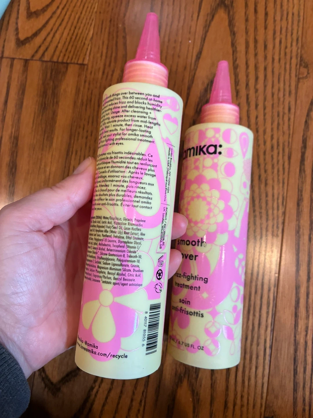 Amika Smooth Over frizz-fighting treatment. This 60 second at-home treatment aims for shiny, healthy-looking hair and delivers healthier-looking hair. It's a professional treatment. 200 ml / 6.7 US fl. oz. bottles.
