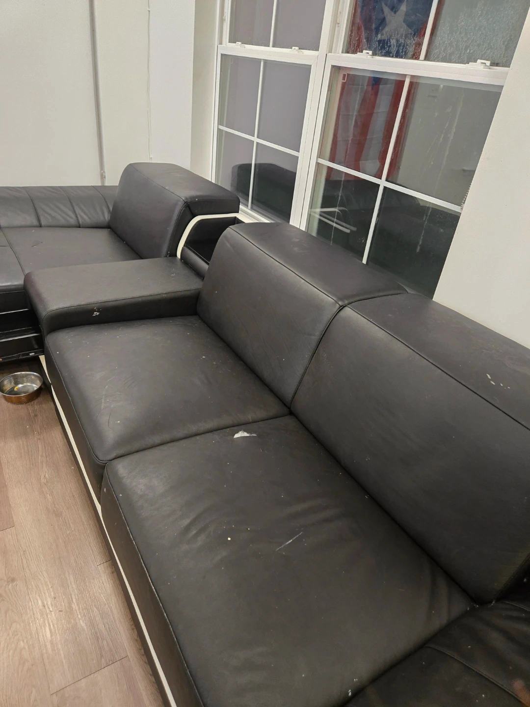 This black faux leather sectional sofa offers a modern design. It features a pull-out storage drawer in one armrest and a small shelf. This is a section of a $4,000 couch, and the other section is posted on my account.