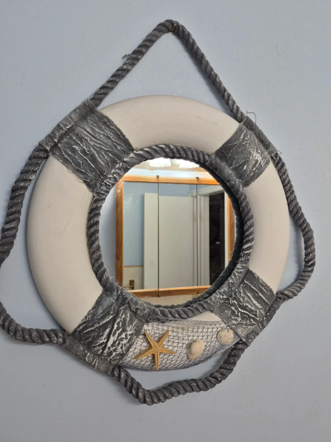 This decorative mirror is designed to look like a nautical life buoy. It's adorned with a starfish, seashells, and a net accent. The sturdy rope and weathered details give it a charming coastal feel. It's perfect for adding a touch of seaside charm to any room!