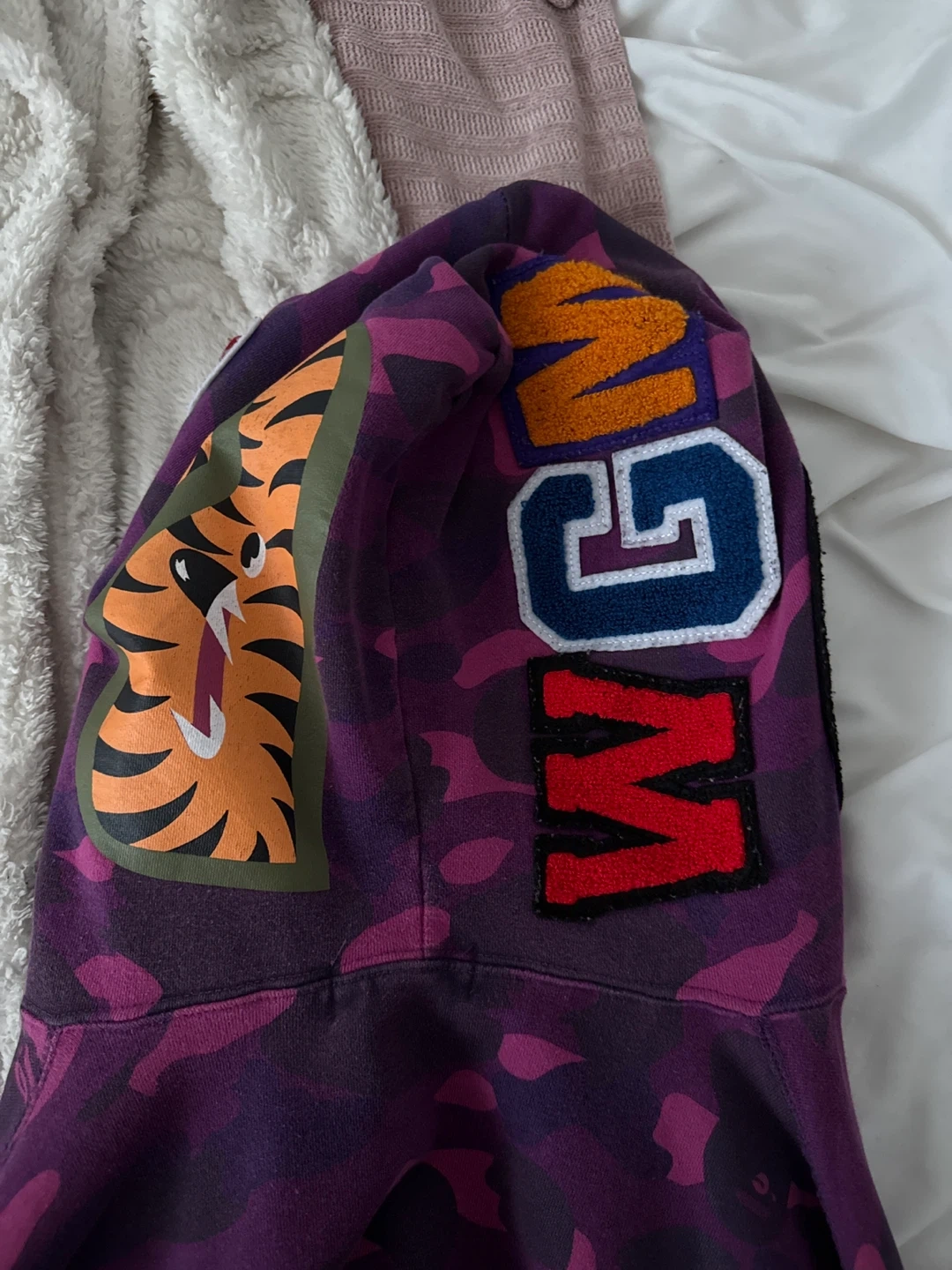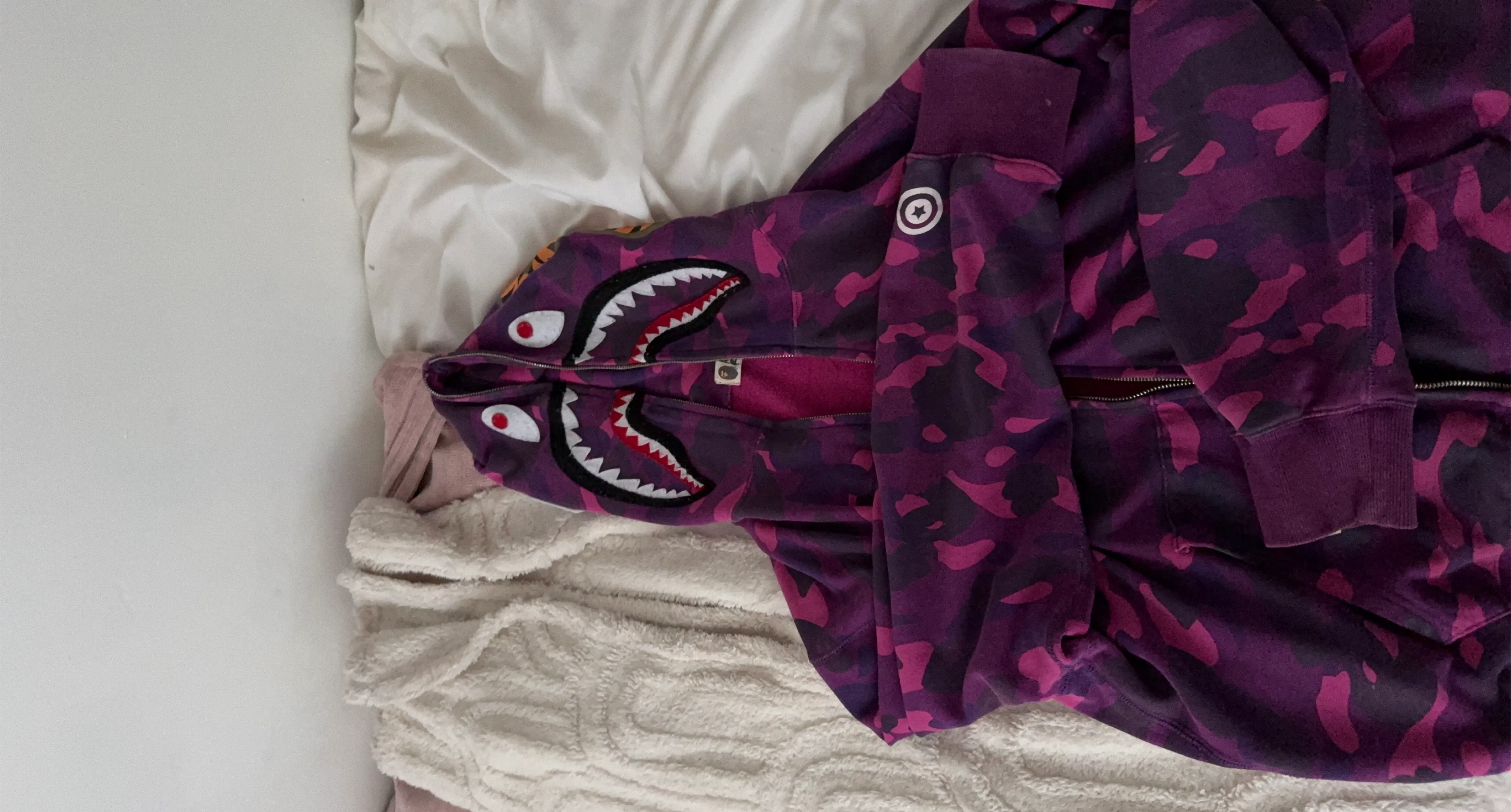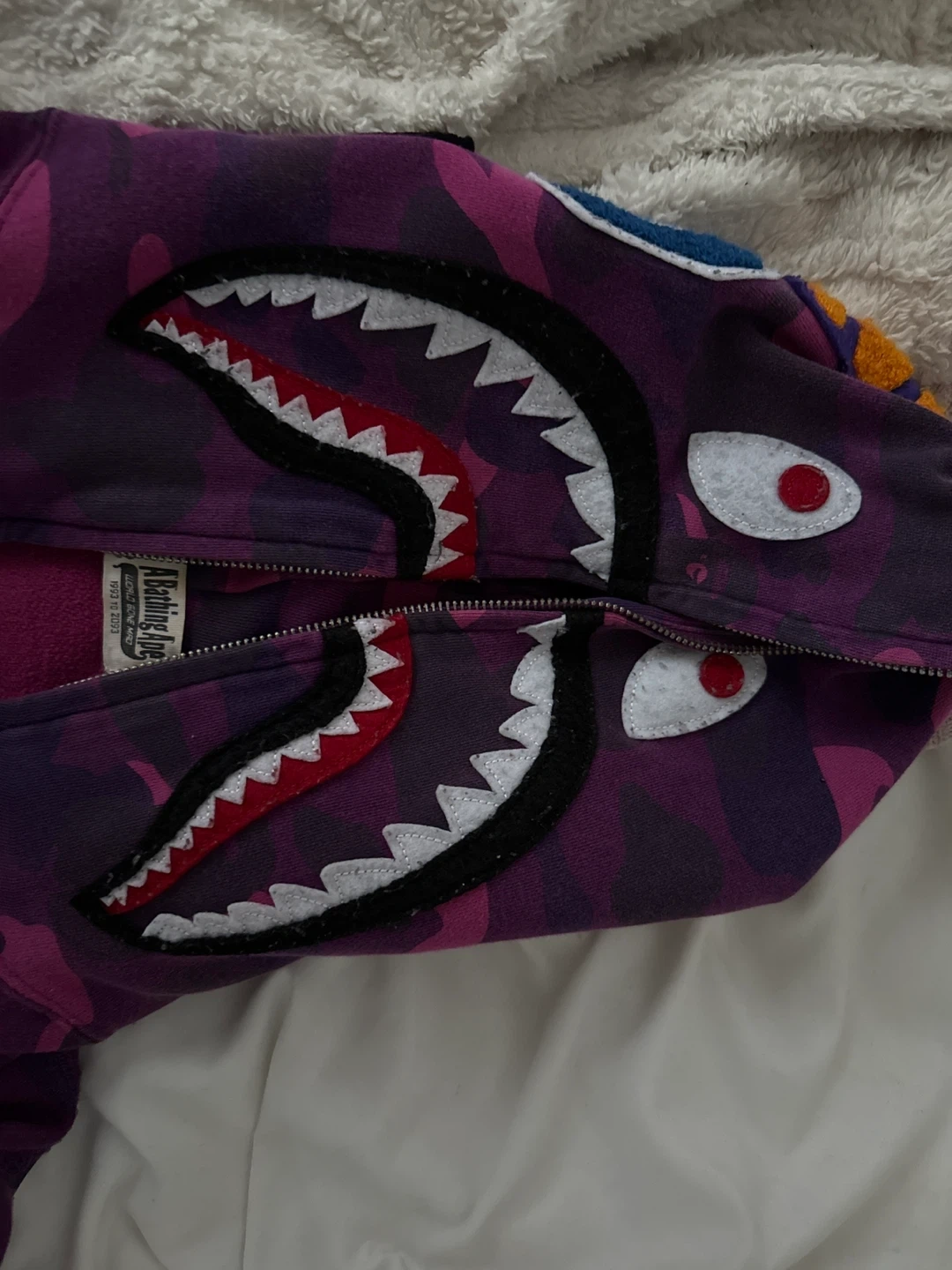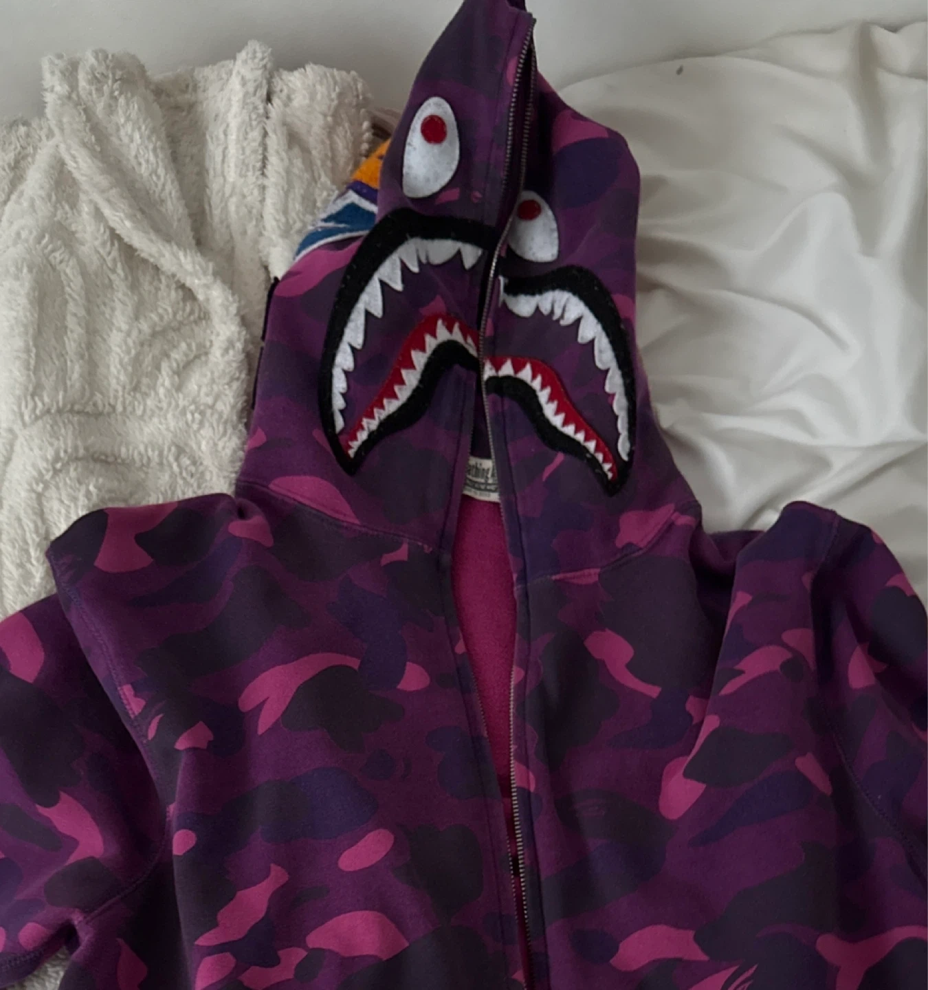 Selling an A Bathing Ape (BAPE) purple camo shark hoodie in size L. It's in great condition beside the fact that the zipper is broken due to wear, but is easily fixable at any store.