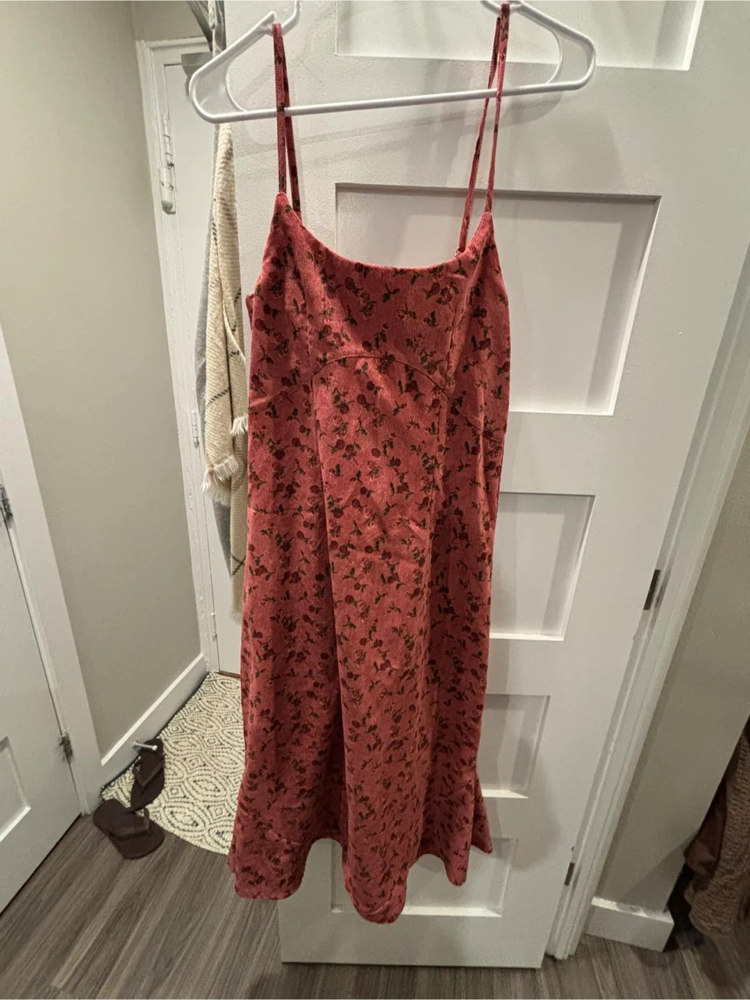 This is a slip dress with a floral print. It features spaghetti straps. The material looks like corduroy.