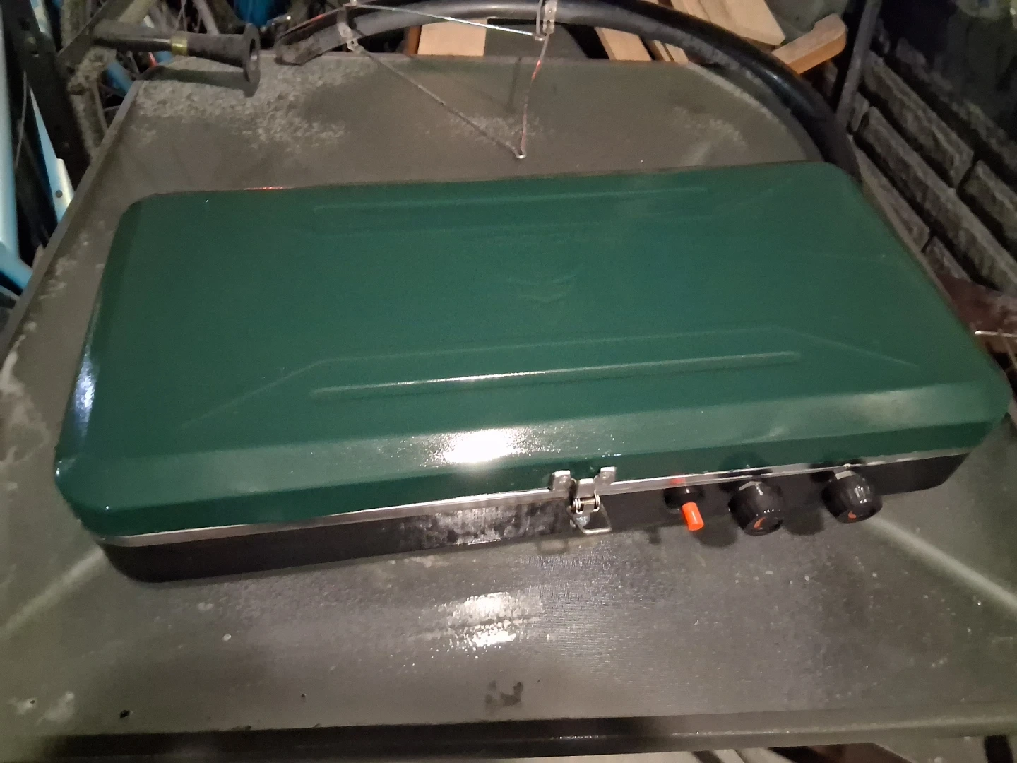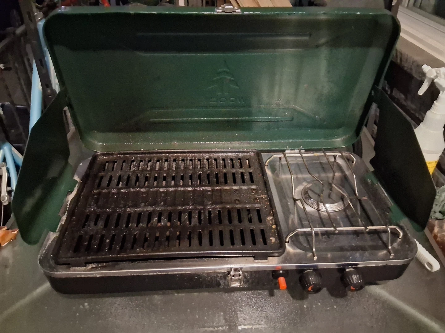 A portable propane camp stove with a grill top. It has two burners and a side windshield. Perfect for outdoor cooking adventures!π₯